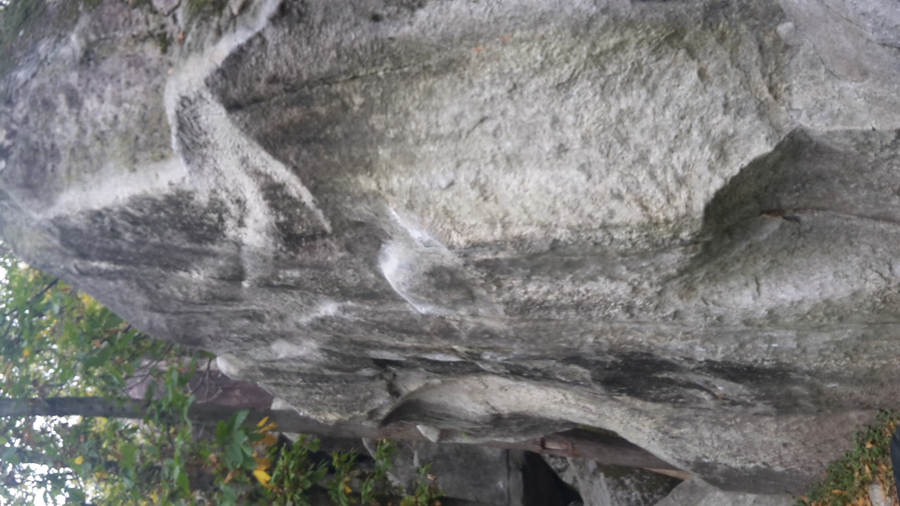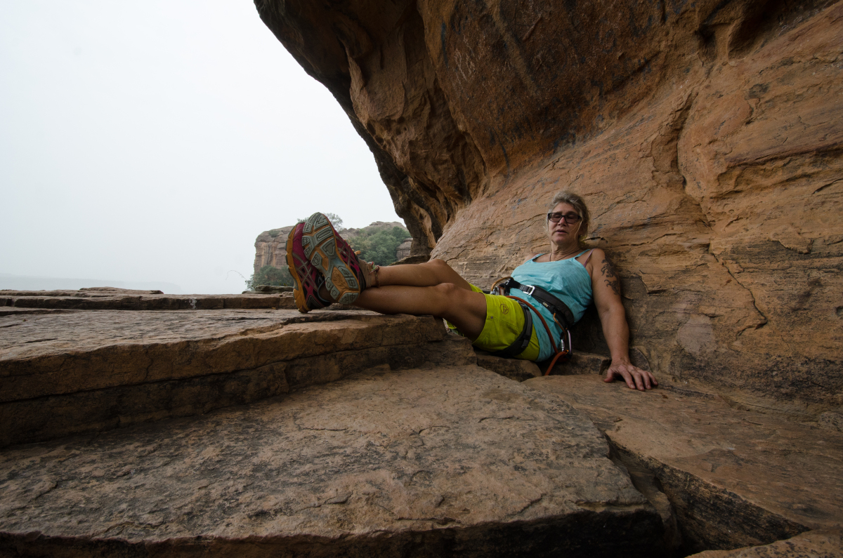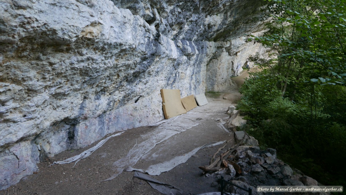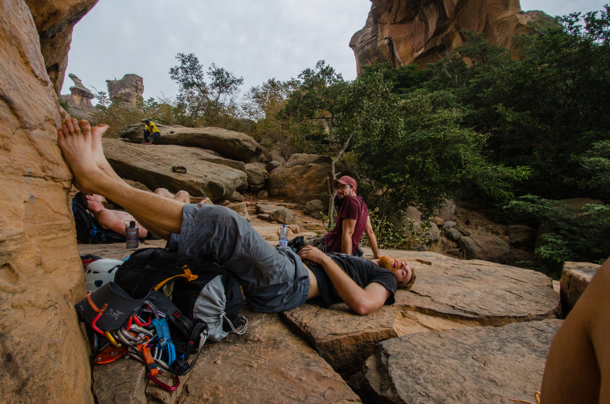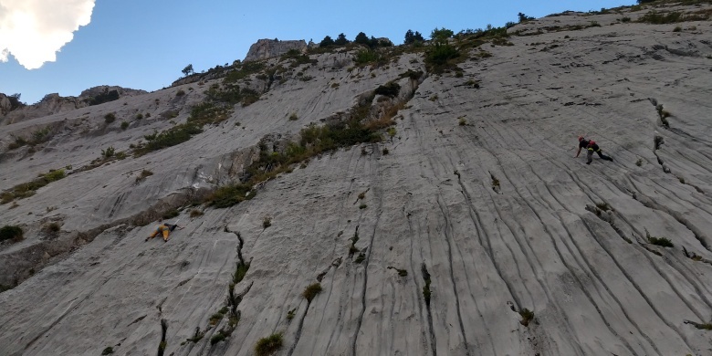 Second départ, nous partons pour une falaise plein sud. Ben oui, c’est mieux de grimper dans le cagnard qu’à l’ombre et avec du vent. Très chouette site de grimpe cette fois-ci, avec en-dessous, une sorte de demi-caverne en amphithéâtre avec quelques voies de grimpe. Nous passons au site et grimpons quelques chouettes voies en 5. Ceci après avoir longuement cherché le bon chemin à travers monts et buis.