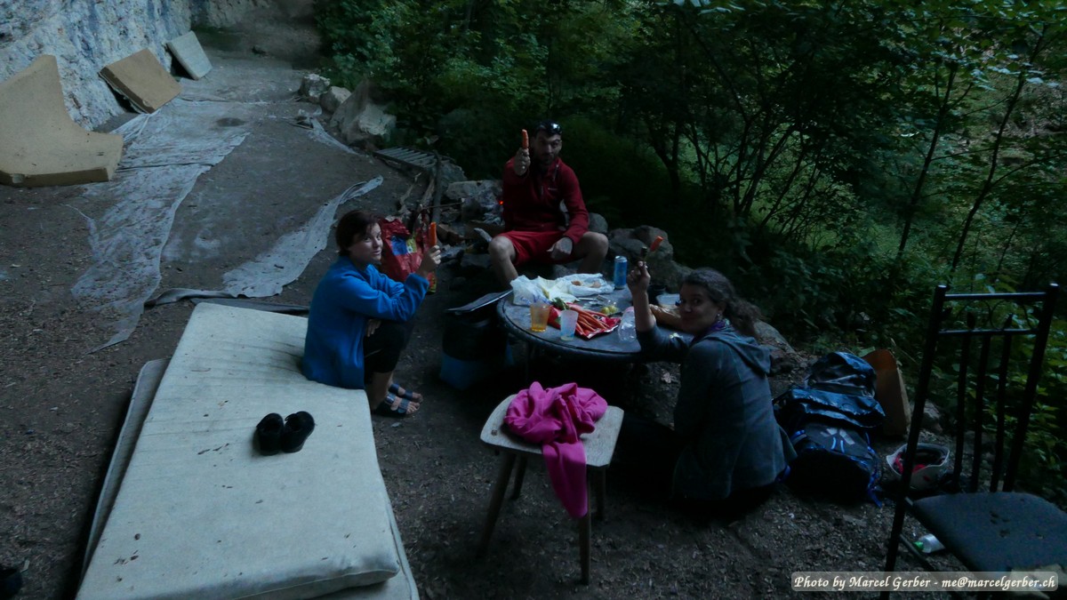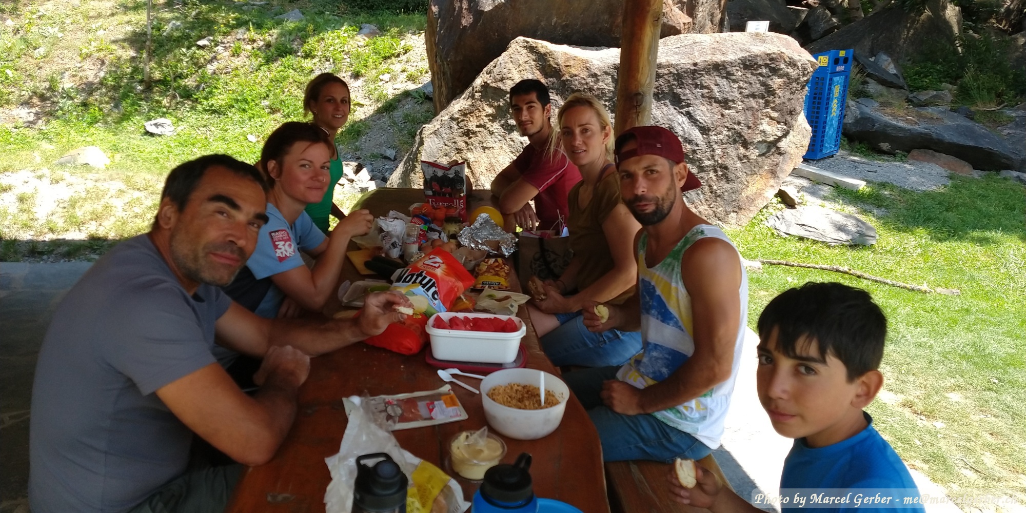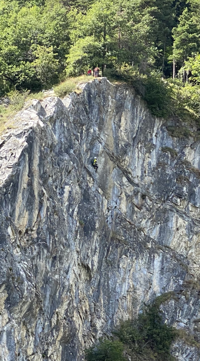 Après le petit-déj’ et le démontage de nos installations au camping, le groupe se scinde en deux. Ceux qui iront faire une grande voie ( Anja, Baptiste, Salem et Sébastien) à Evolène , le pilier Albert. Et les autres iront grimper à la falaise de Sanière dans les hauts de Haudère.