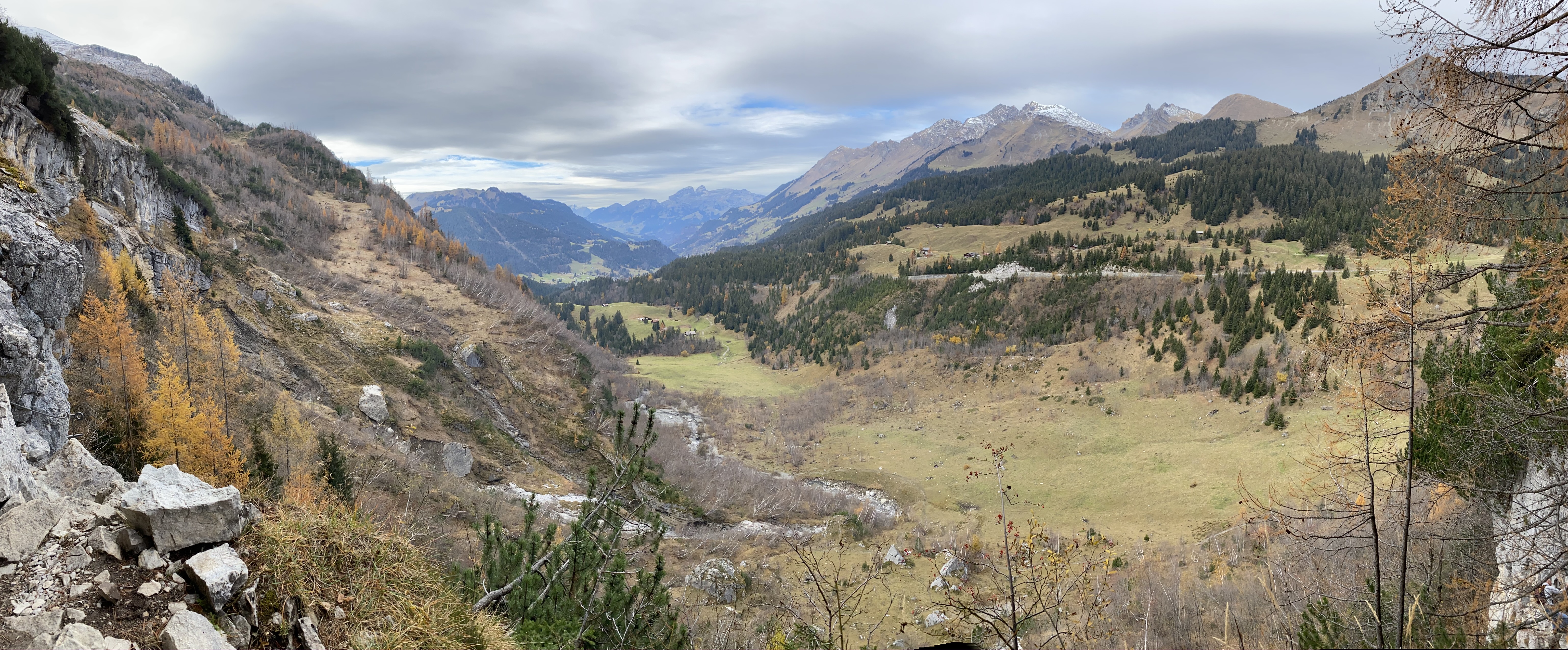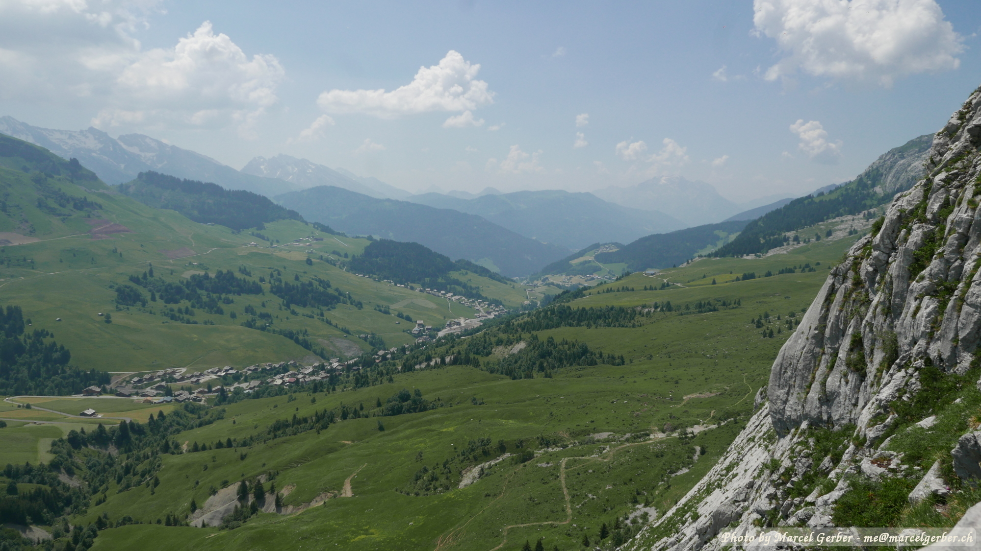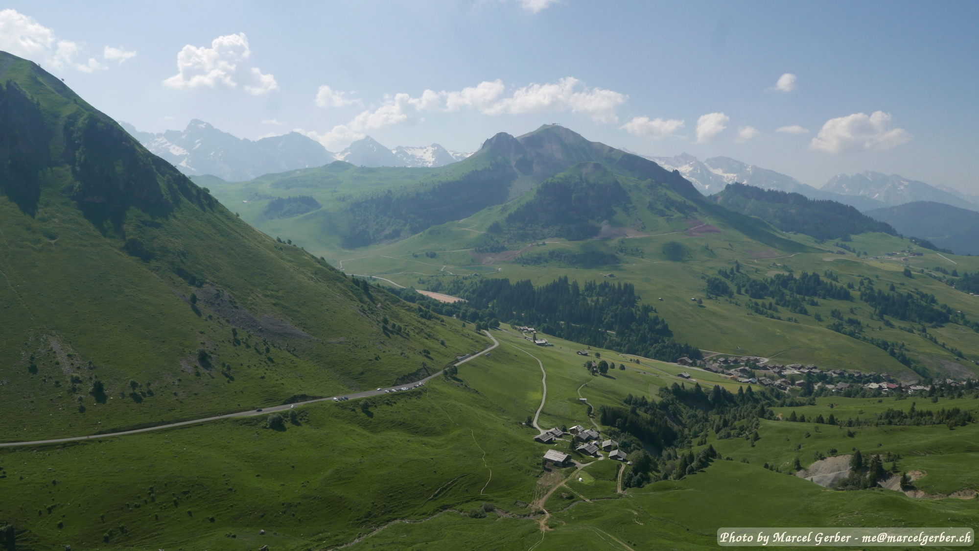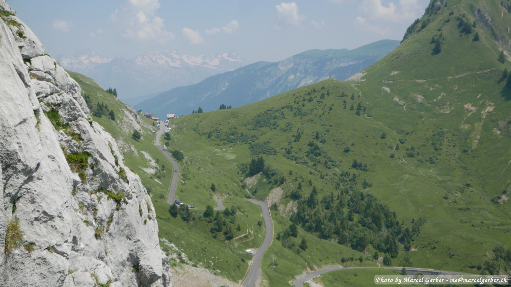 La magnifique vue tout au long de l'ascension donne sur la vallée et la route qui monte au col de la Colombière. On y entend malheureusement que trop bien les motards défiler à toute vitesse.