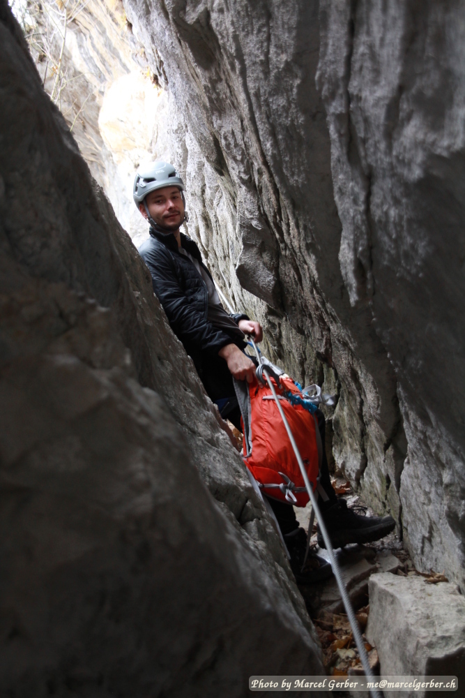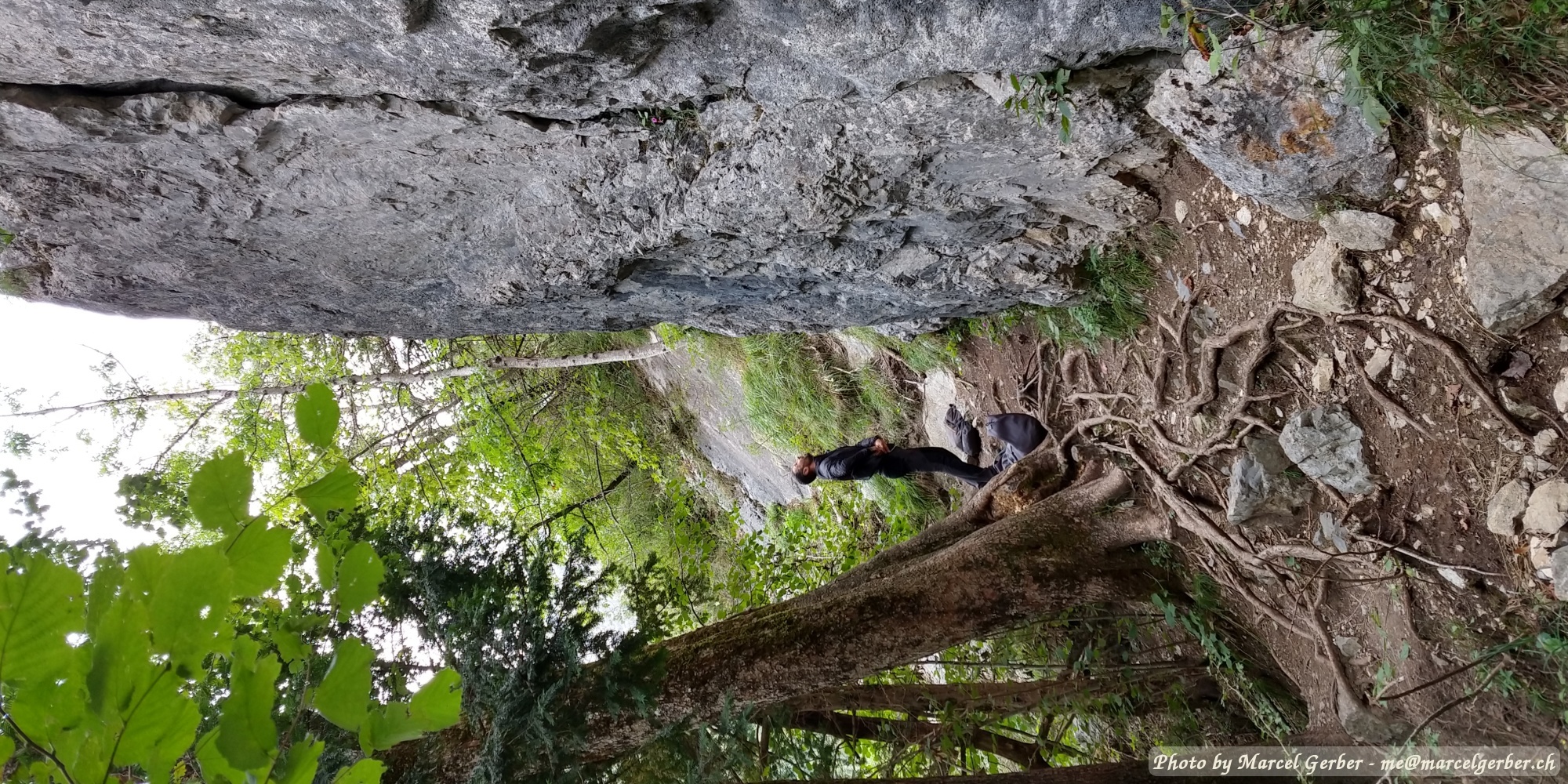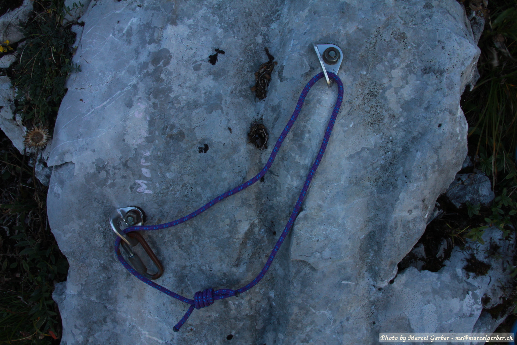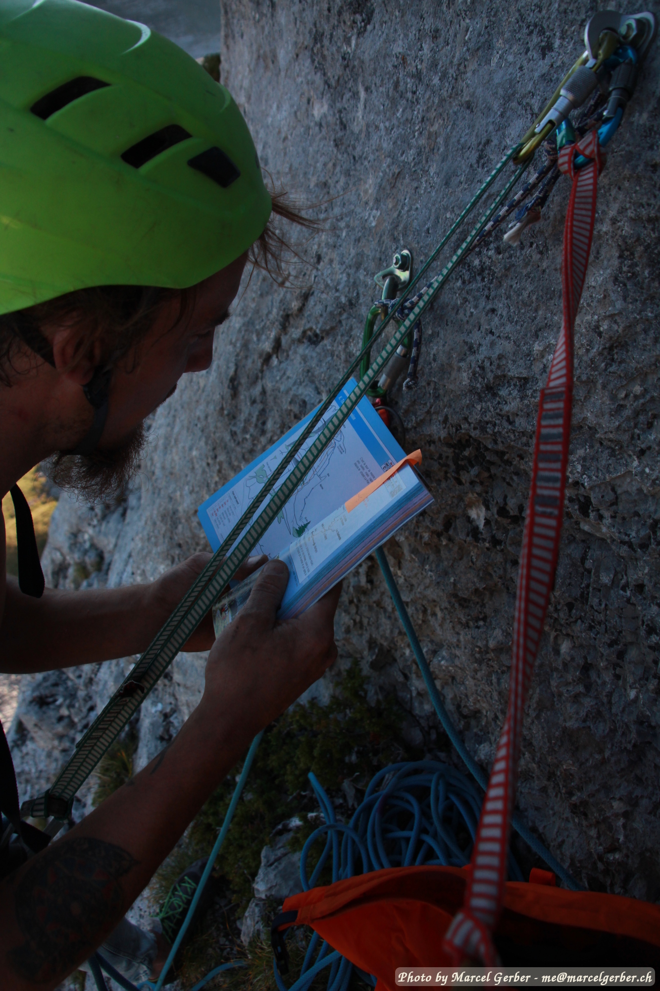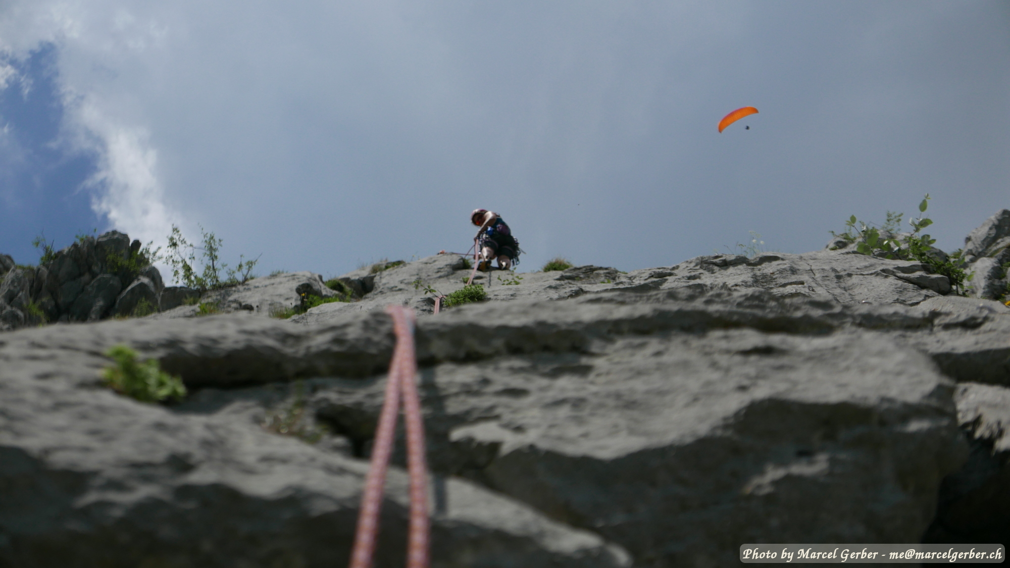 Moment de détente, selfie et sandwich au sommet. Ensuite c’est une descente scabreuse entre gravier et terre humide. Le pied doit être sûr ! On contourne le Petit Pouce pour s’attaquer au Grand Pouce. Deux longueurs de 5b avec 5 spits au total. On fera une seule longueur et on complétera avec nos friends si on ne les a pas oubliés dans le sac… C’était bien engagé par moment et grimper en chaussure d’approche n’était pas une bonne idée ! :-D Cette longueur nous as bien usée physiquement et mentalement. On commence à se rendre compte qu’il faut qu’on avance car on est à la bourre. On contourne le chat, on gravit la Pyramide en vitesse. Je mets un coup d’accélérateur à la descente et me retrouve rapidement dans le dièdre péteux des Marchzähne. Pendant ce temps, les copains se perdent dans la descente scabreuse. Mes mauvaises indications n’aident pas non plus… Désolé ! Pour gagner du temps, je monte un système de moulinette pour ce mur. J’assure en second les 5 copains comme ça, c’est moins expo, plus rapide et ça me fait les bras.
