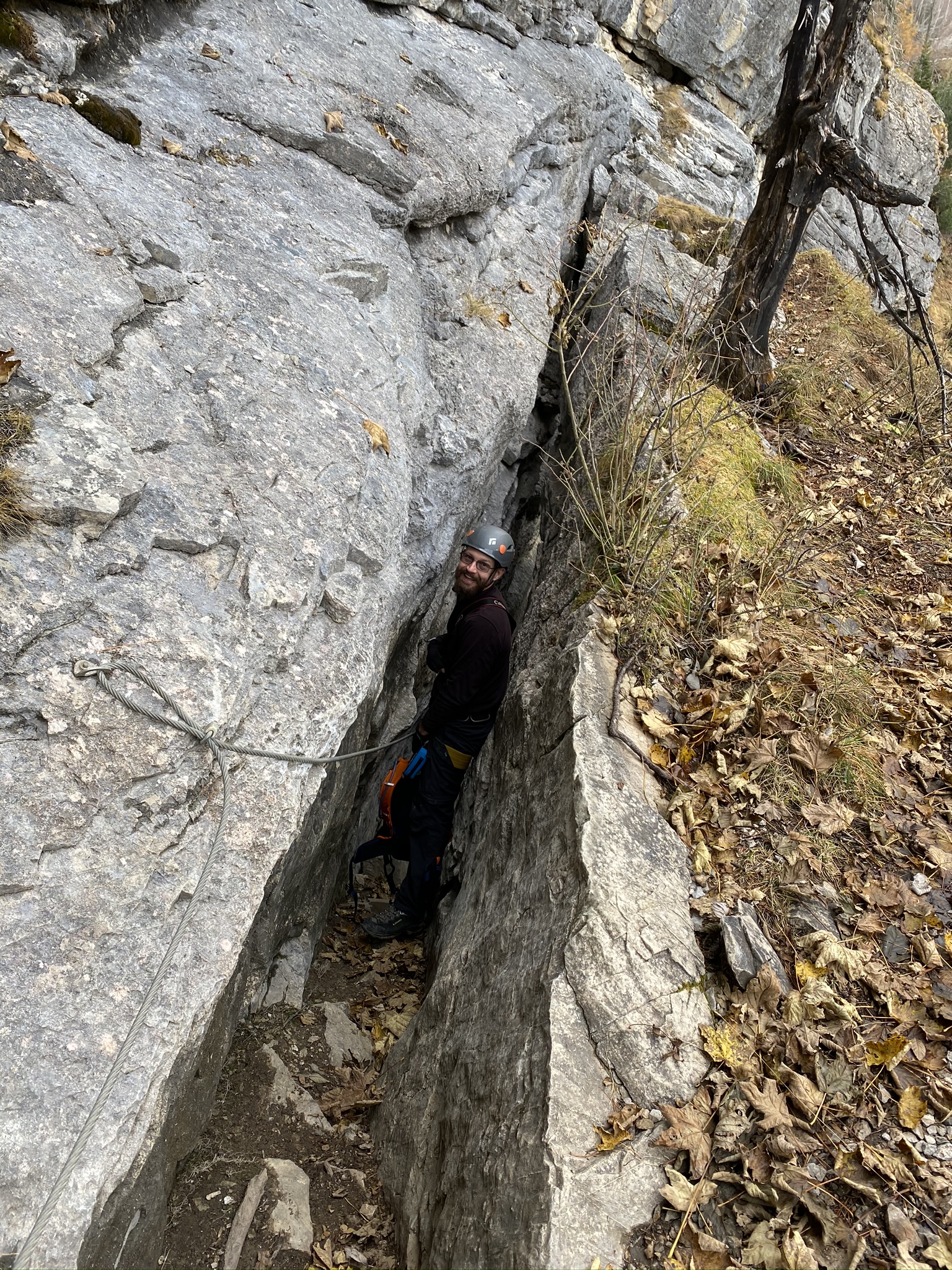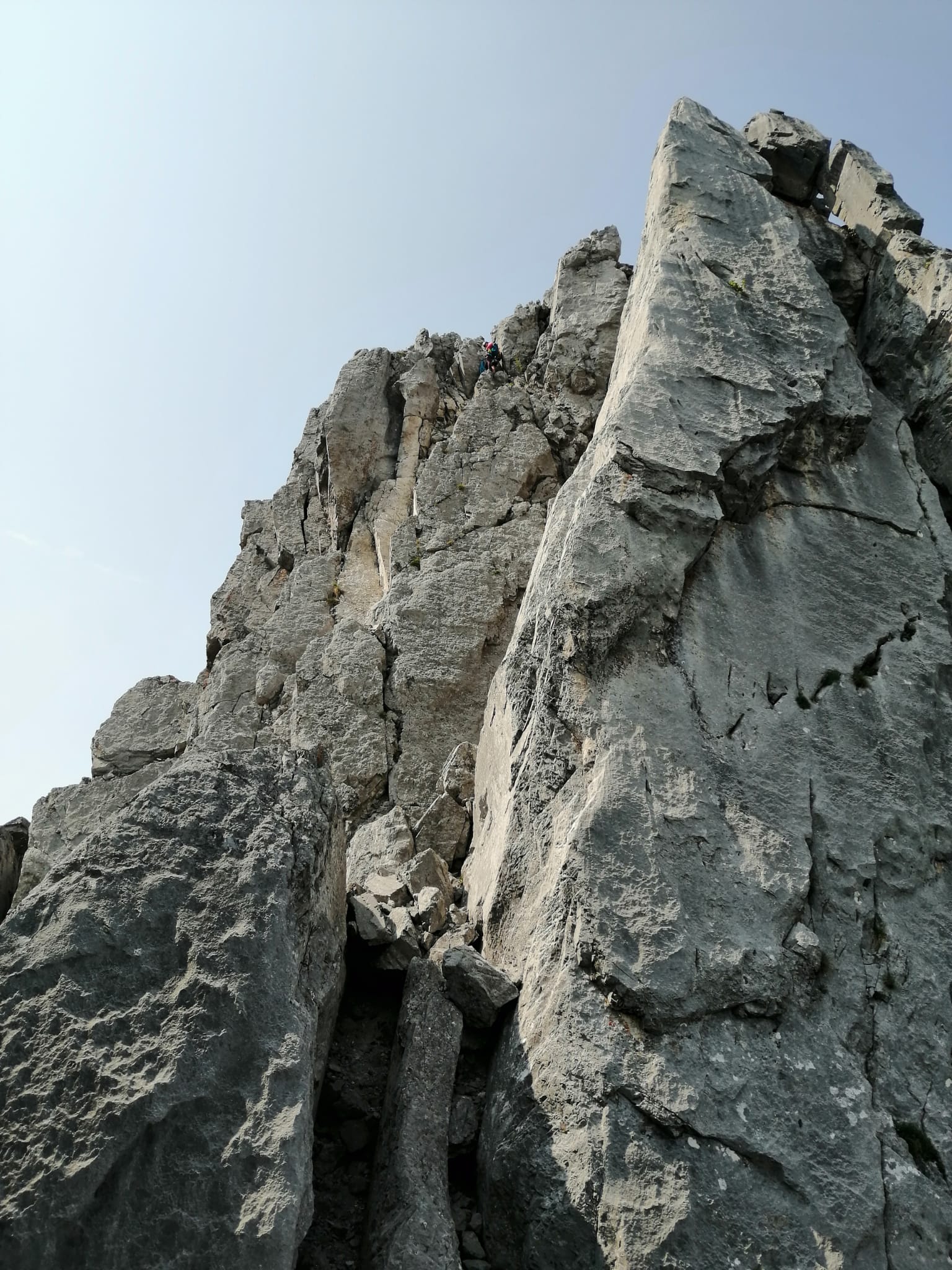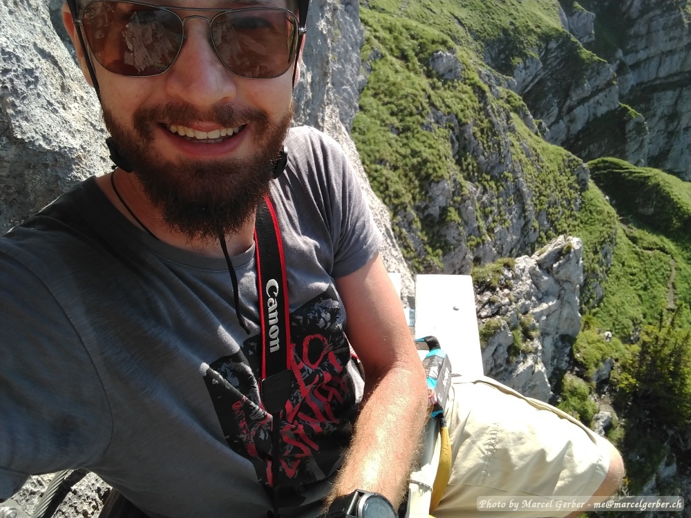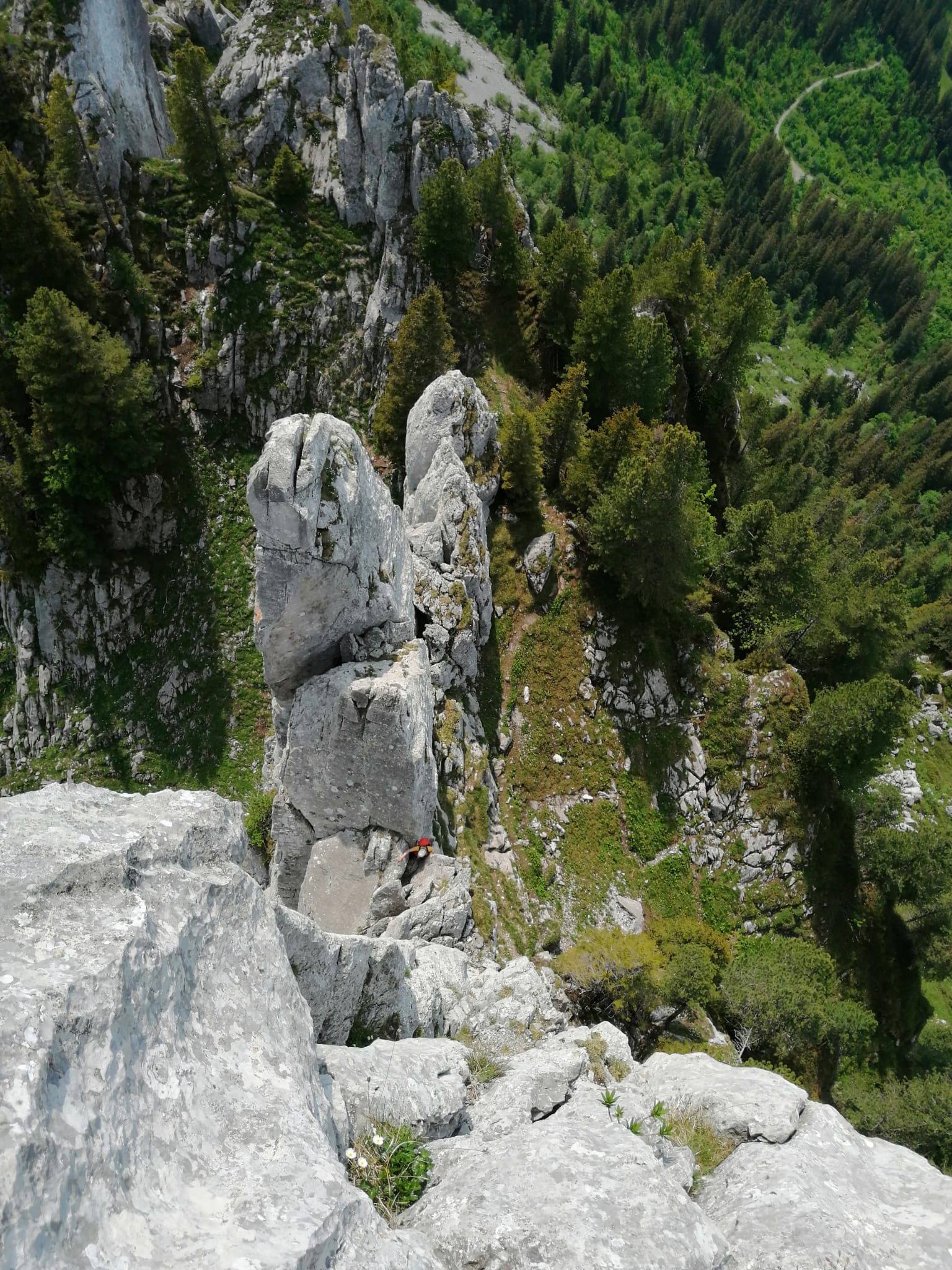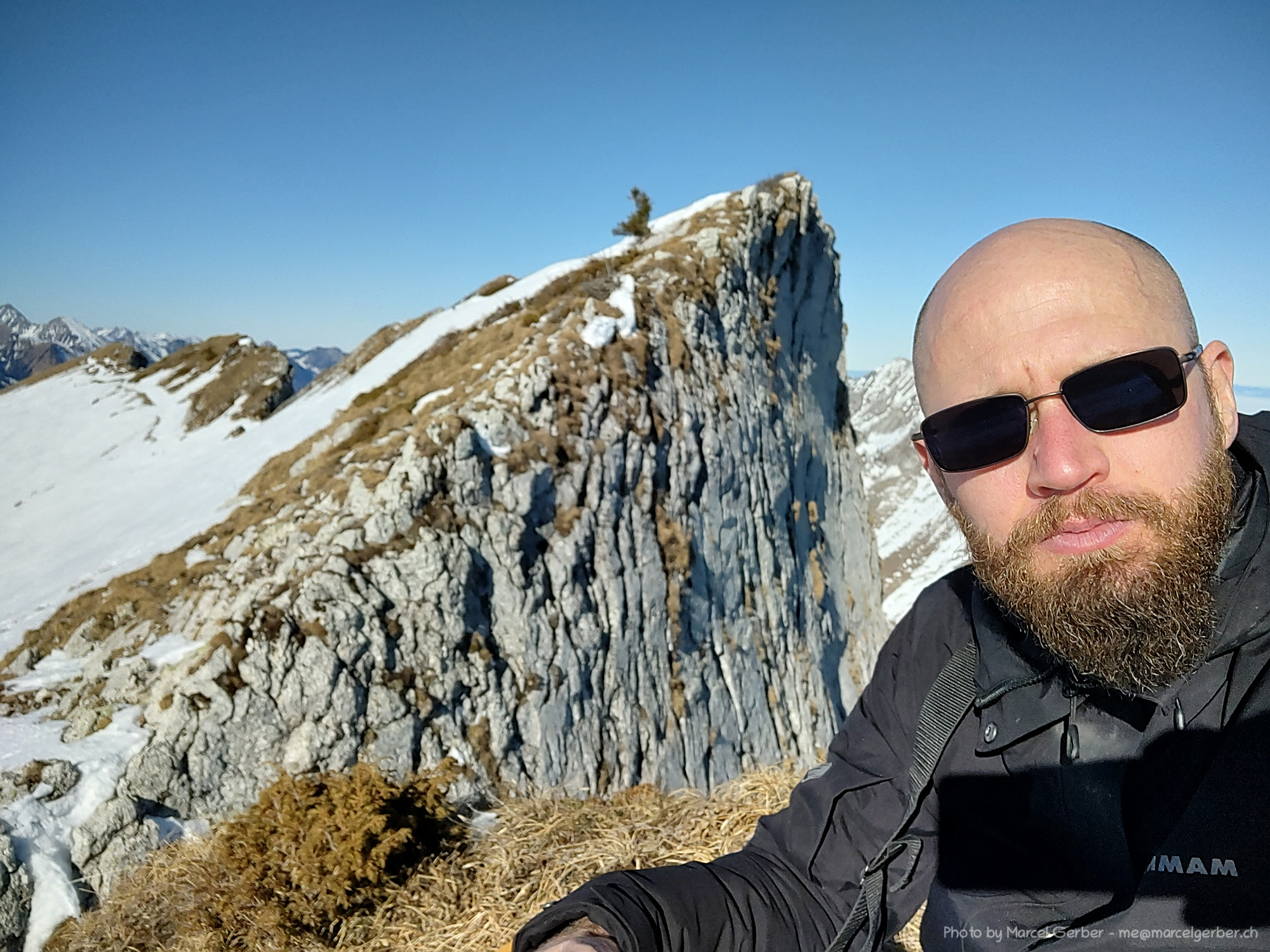 Moment de détente, selfie et sandwich au sommet. Ensuite c’est une descente scabreuse entre gravier et terre humide. Le pied doit être sûr ! On contourne le Petit Pouce pour s’attaquer au Grand Pouce. Deux longueurs de 5b avec 5 spits au total. On fera une seule longueur et on complétera avec nos friends si on ne les a pas oubliés dans le sac… C’était bien engagé par moment et grimper en chaussure d’approche n’était pas une bonne idée ! :-D Cette longueur nous as bien usée physiquement et mentalement. On commence à se rendre compte qu’il faut qu’on avance car on est à la bourre. On contourne le chat, on gravit la Pyramide en vitesse. Je mets un coup d’accélérateur à la descente et me retrouve rapidement dans le dièdre péteux des Marchzähne. Pendant ce temps, les copains se perdent dans la descente scabreuse. Mes mauvaises indications n’aident pas non plus… Désolé ! Pour gagner du temps, je monte un système de moulinette pour ce mur. J’assure en second les 5 copains comme ça, c’est moins expo, plus rapide et ça me fait les bras.