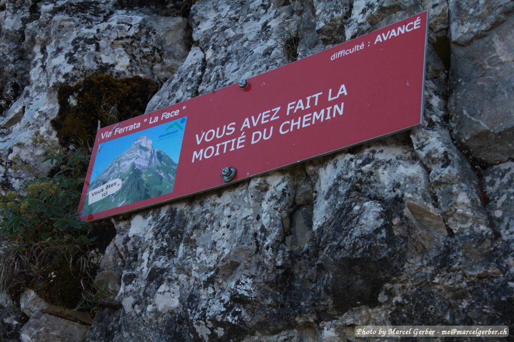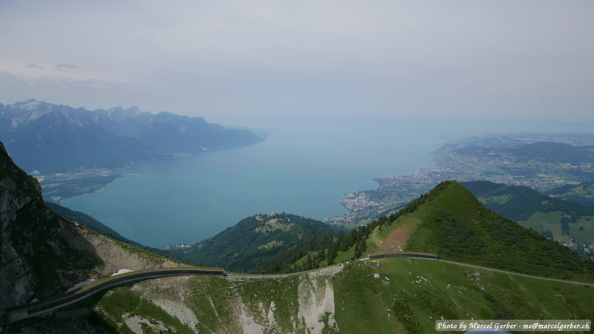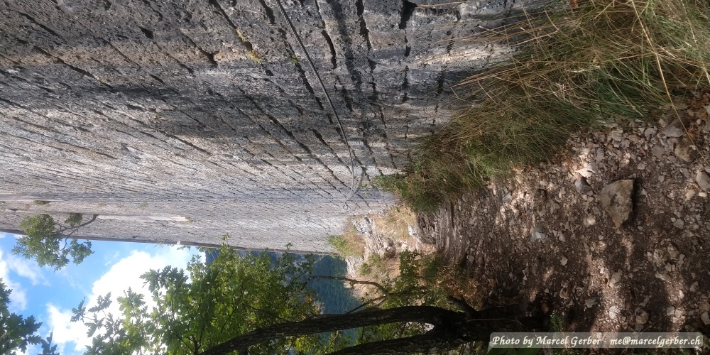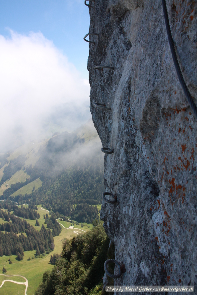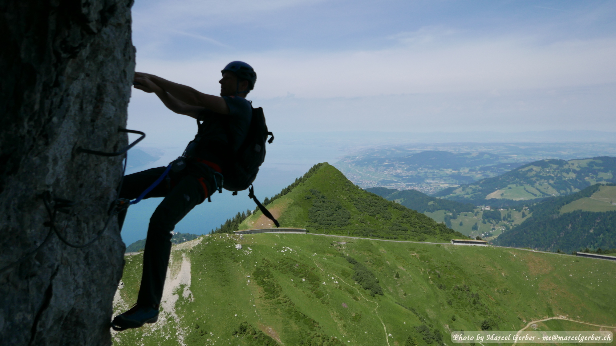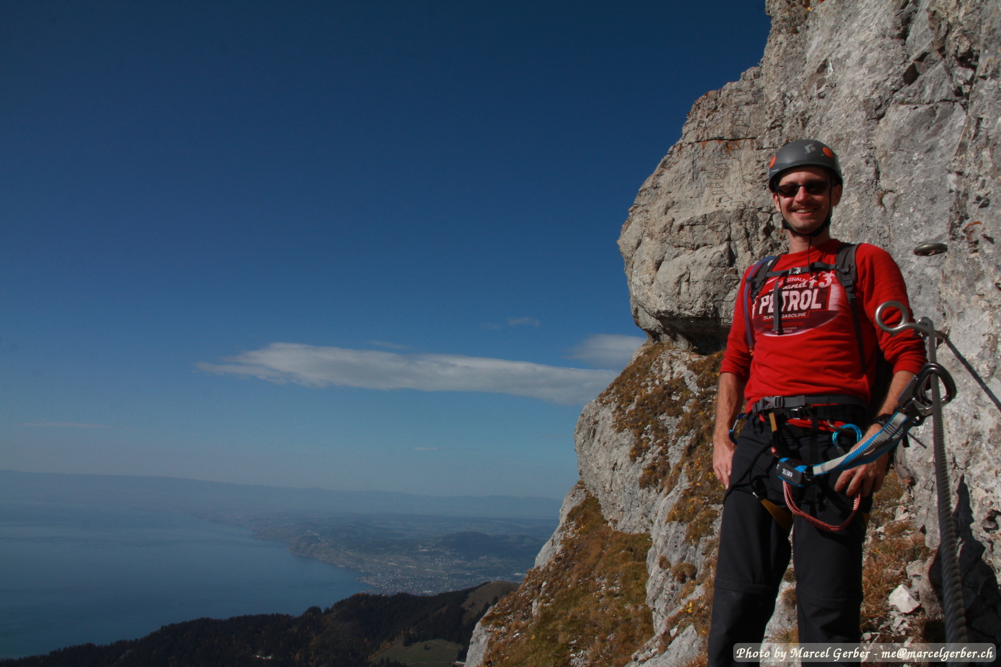 Dès les premiers mètres, la vue est splendide. La vie continue dans la falaise, face au lac et avec la Dent de Jaman en premier plan. Des images magnifiques vous resteront en mémoire si vous avez oublié votre appareil photo (rassurez-vous, ce n'est pas arrivé cette fois).