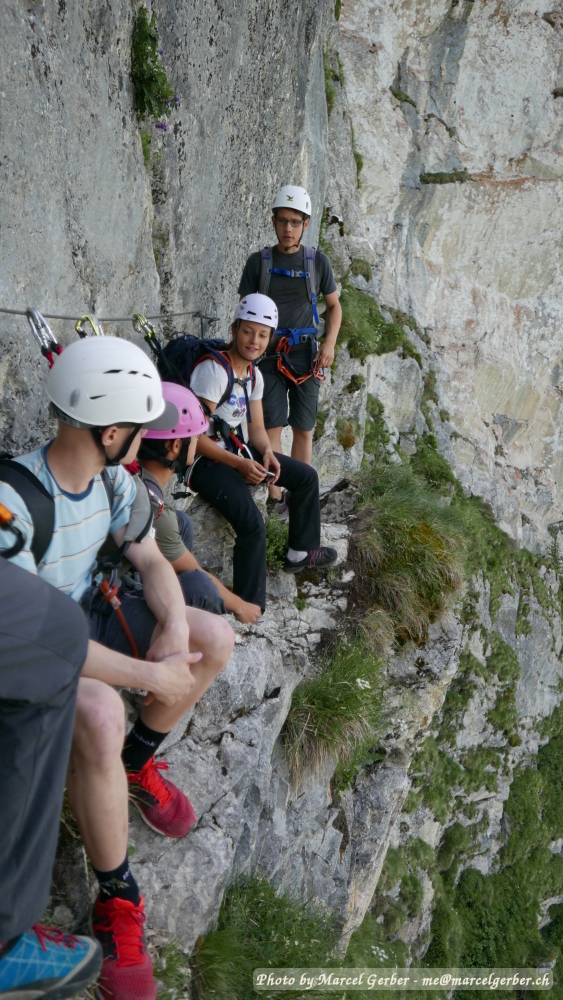 La voie est plein soleil, il est donc préférable de commencer assez tôt. Nous avons pu dépasser un groupe du CAS avec René le chef de bande et ses 3 acolytes, dont deux débutaient. Heureusement, car sinon, les attentes aux relais auraient été longues. Il faut compter entre deux heures et demie et trois heures pour arriver au dernier relai. Après il faut encore compter à peu près une heure et demie de descente en rappel.
