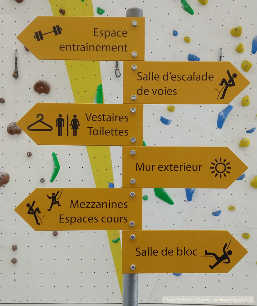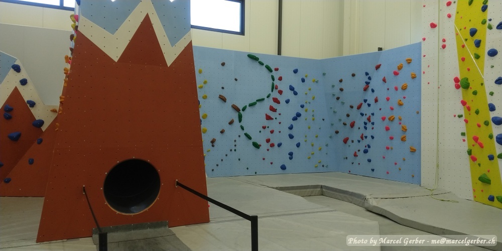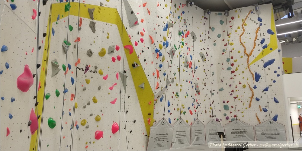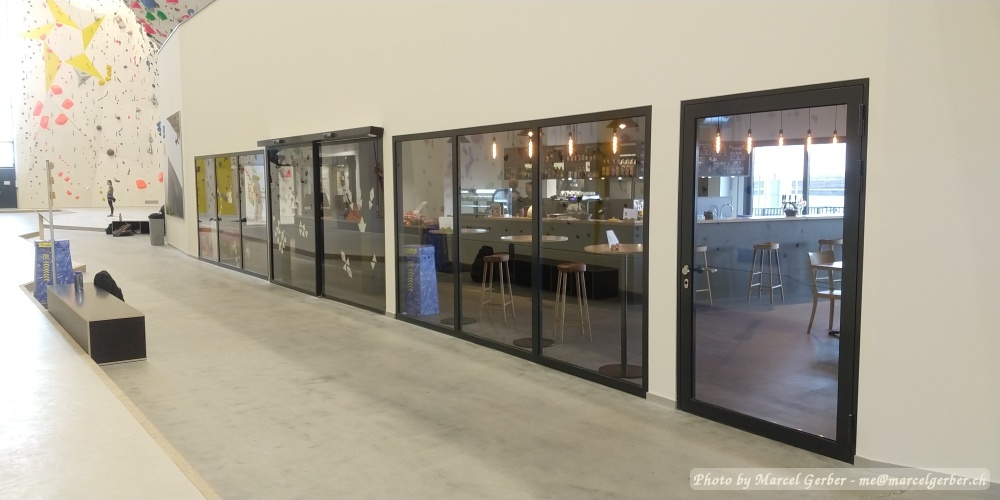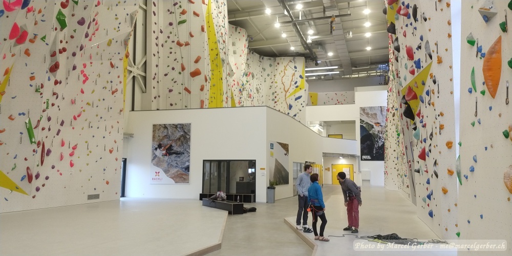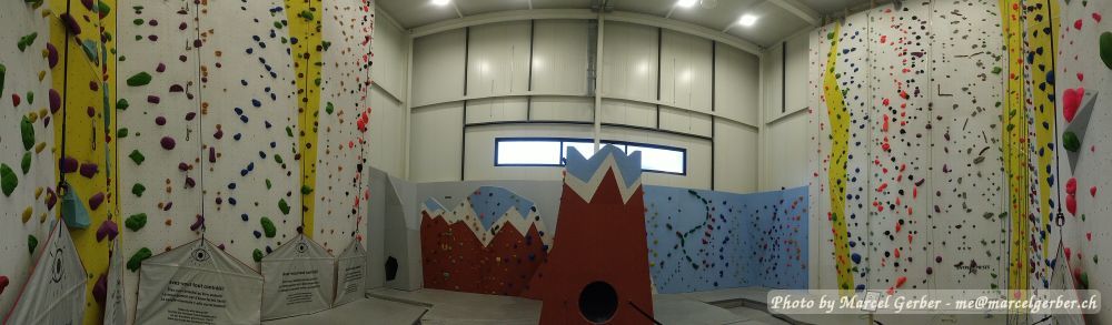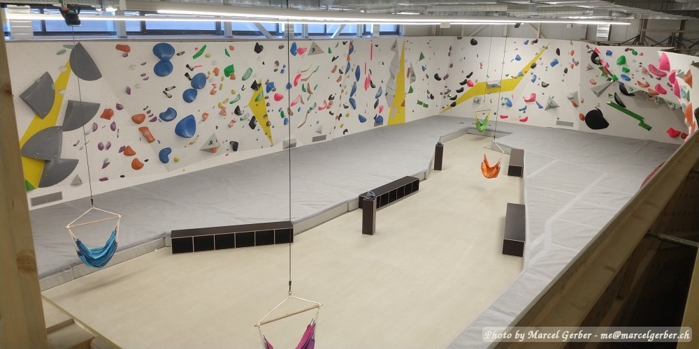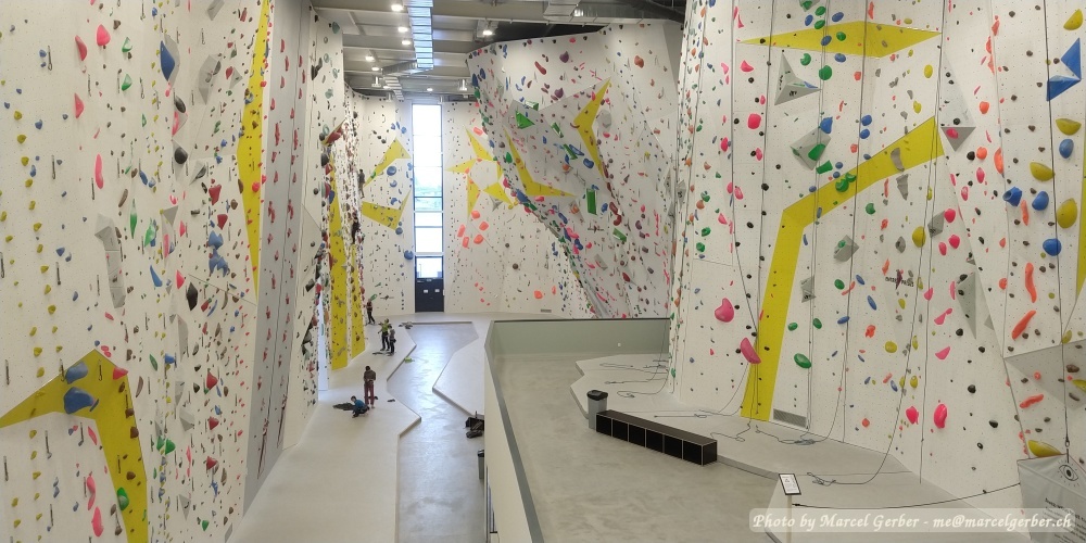 Avec toute la publicité de Grimper.ch, on pourrait se dire que la nouvelle salle devrait nous impressionner à première vue. Malheureusement, dû à son espace au sol quelque peu réduit en comparaison avec la surface de grimpe, le tout à presque l'air plus petit qu'à RocSpot. Mais c'est carrément trompeur. En réalité, la surface de grimpe est agrandie non seulement grâce à ses plus ou moins quatre mètres de hauteur en plus, mais aussi par sa longueur de mur au sol.