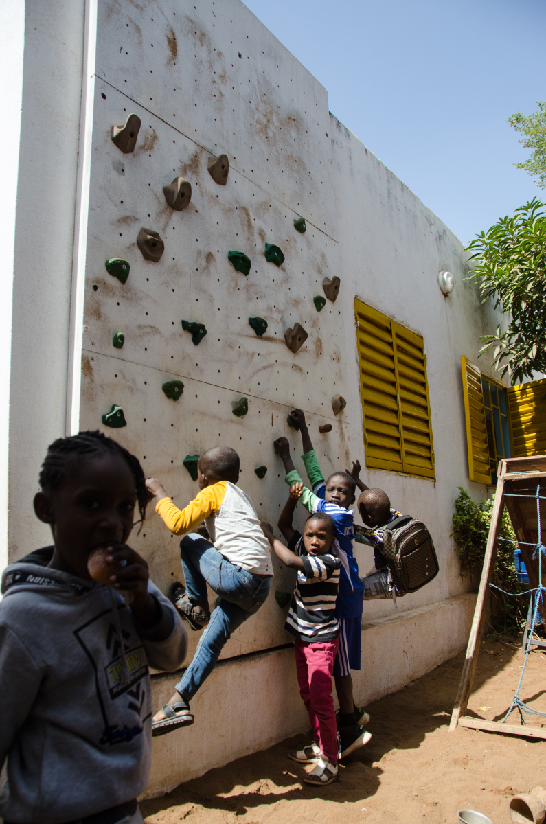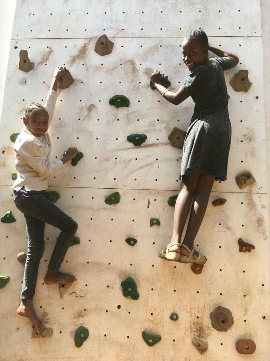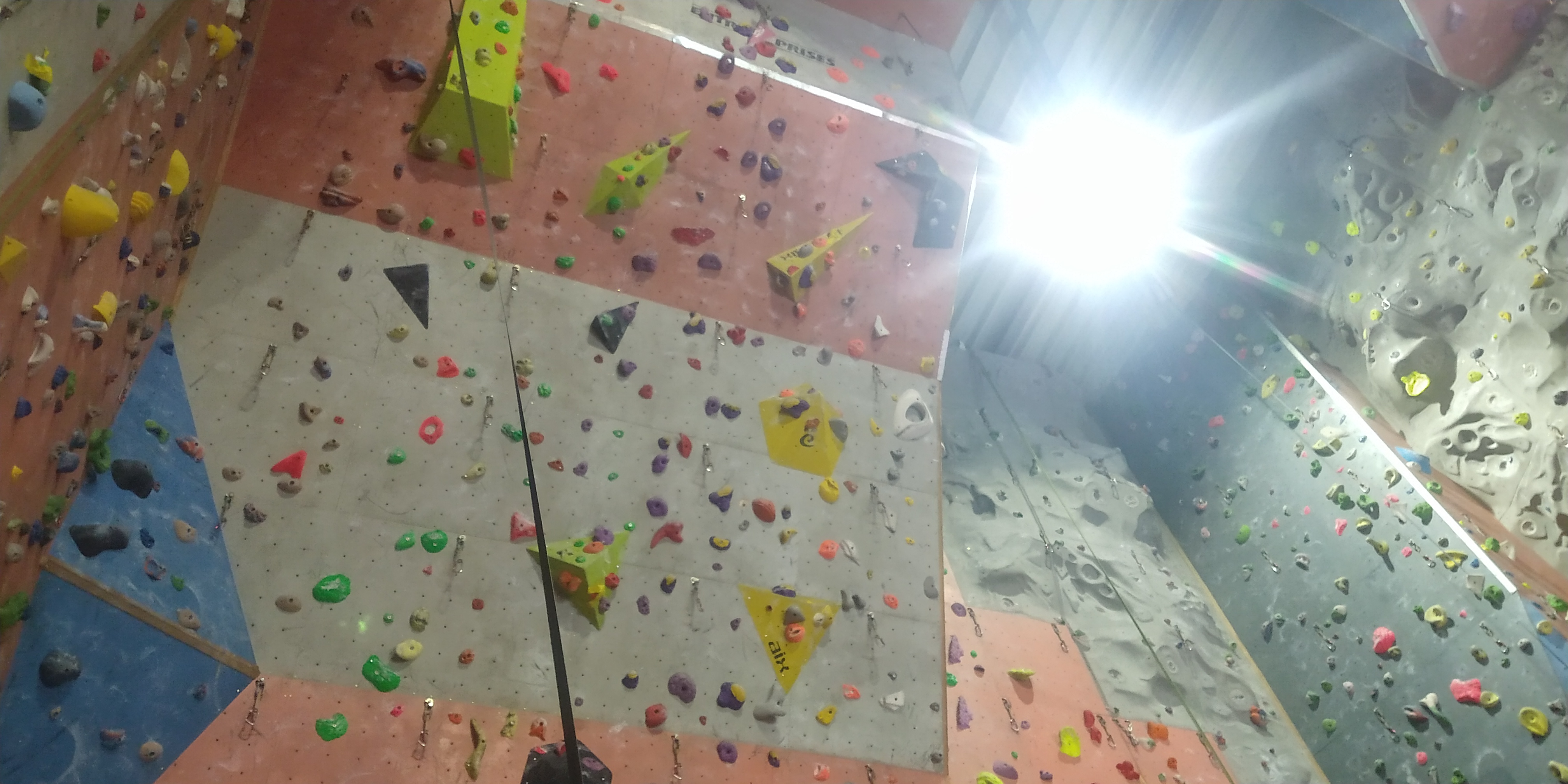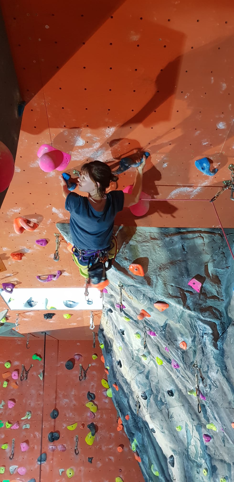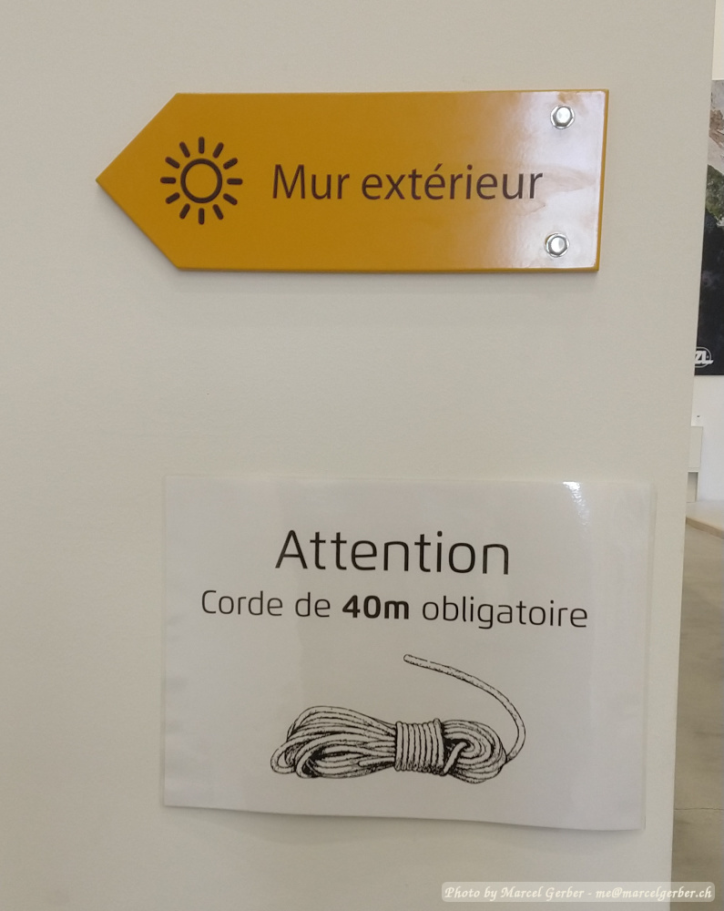 Pour trouver les voies en moulinette et en auto-assurage, il faut monter à l'étage, ce qui nous fait perdre les quatre mètres supplémentaires d'avant. De plus, des espaces de blocs et blocs pour enfants sont dans d'autres pièces. L'extérieur n'étant pas encore terminé, nous n'avons pas pu l'essayer.