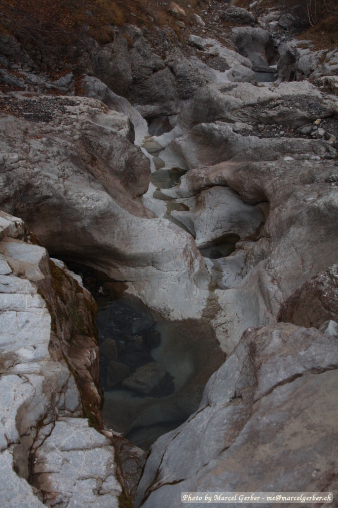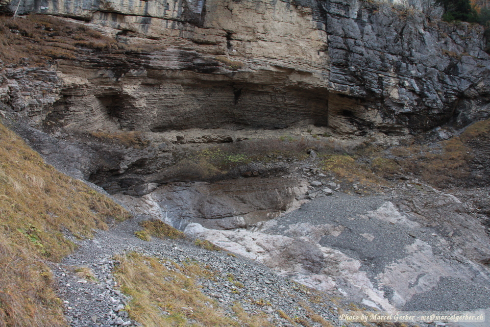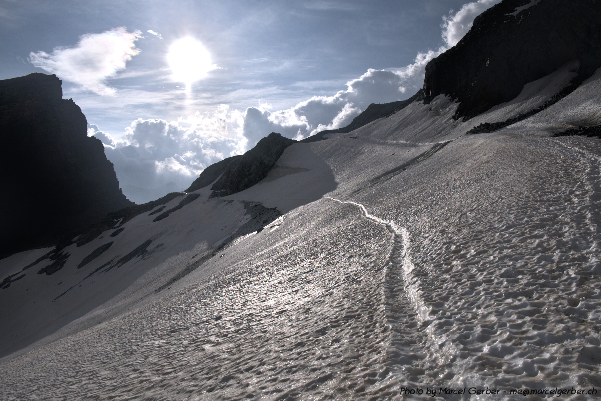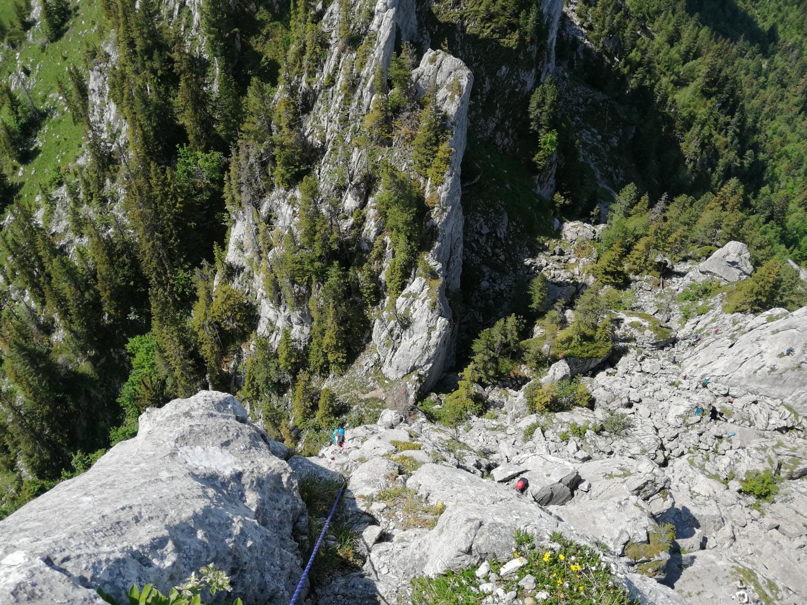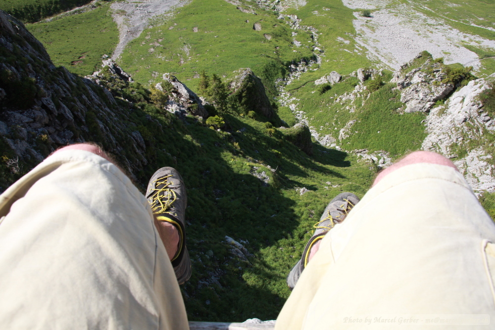 On a fini la partie grimpe, plus que le retour à pieds, Youpi !! Ah non on doit remettre les baudards après 100m, il y a une main courante à poser pour passer 5 mètres exposés à la chute. Bon après ça c’est bon, c’est rando façon Gastlosen. C’est-à-dire que le chemin est difficile à trouver et qu’il est aussi difficile à ne pas perdre. Les cairns, le bon sens et mes souvenirs aideront à trouver la bonne sente ! Dernière grosse remontée dans une combe, un rocher de la taille d’une machine à laver se détache et déboule droit sur le sentier. A la dernière seconde avec Vincent, on l’évite. Il passera à moins d’un mètre. Camille s’était arrêtée bien plus bas. Nous sommes CHANCEUX !!! Nous testons les autres rochers pour purger, rien ne bouge pour le moment…