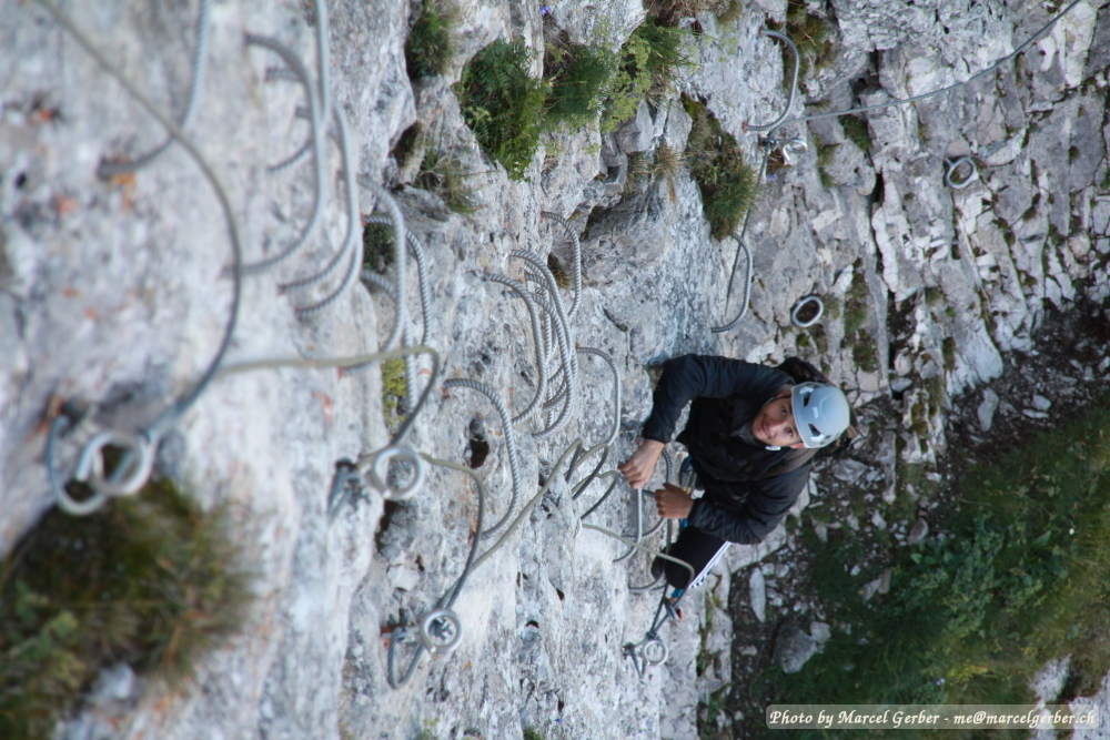 Ce que je trouve vraiment différent dans les via ferrata, c'est le fait qu'on s'accroche souvent à des échelons, souvent en plein gaz, souvent avec rien pour se rattraper. L'erreur est tout de suite fatidique. On ne peut pas vraiment se permettre de tout lâcher, de tomber. Une chute en via, je ne préfère pas tenter: c'est 5 mètres jusqu'au bout de la longe.