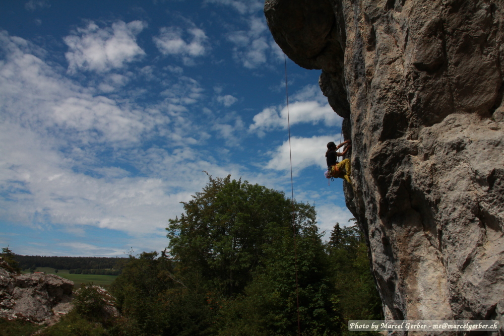 Nous avons profité d'une belle journée après la soirée d'inauguration de l'association. Une petite équipe sympa, composée de Alexis, Anna, Damien, Linda, Marcel, Michael, Olivier et Sophie. Nous avons commencé par de la dalle en 5c, qui est plutôt difficile pour des inaptes (enfin je parle pour moi là) de la dalle. Les murs en 6a sont plus faisables. Ensuite, Babylone, une 6a superbe avec un joli dévers en première partie et une seconde partie en dalle. Pas très difficile mais superbe. Cette voie offre des possibilités de prises intéressantes, telles que trouver des prises inversées, ou dans des fissures. Les pieds sont généralement bons.