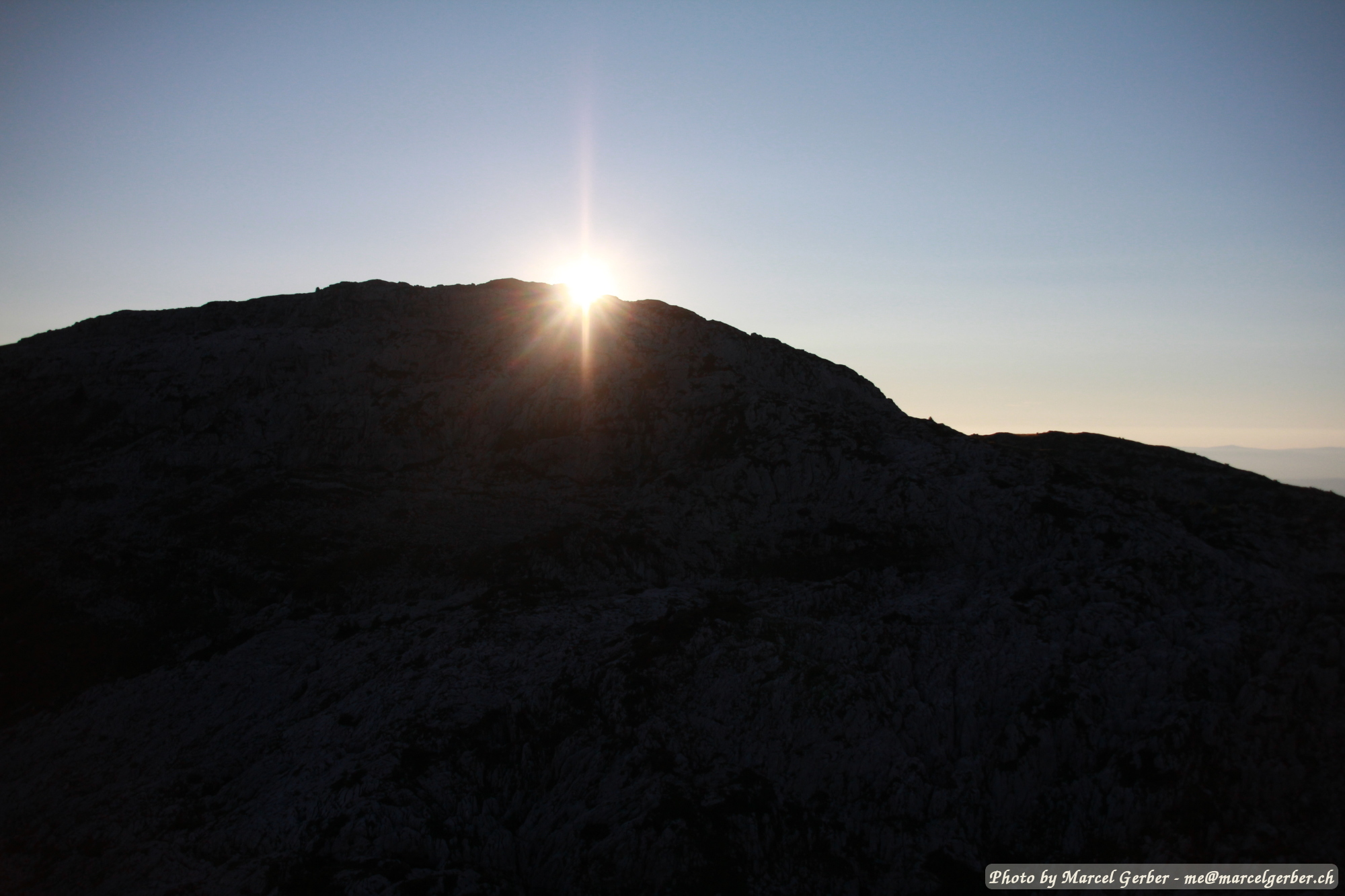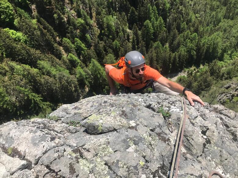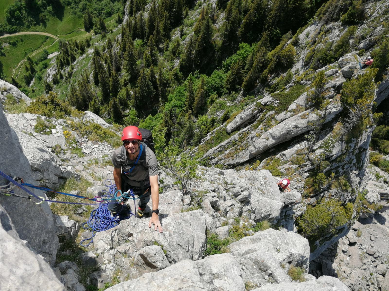 La suite c’est de la traversée se fait sans encordement. Ce n’est pas compliqué mais c’est expo et la chute n’est pas une option. Tout le monde se sent bien et ça nous permet d’avancer rapidement dans ce genre de terrain difficilement protégeable de toute manière. J’installe quand même une main courante pour un passage et Daniel en teste la résistance. La dernière longueur est ultra expo en III. Je passe devant, il n’y a qu’un spit sur la traversée oblique. Je remets mon système de moulinette en étant vaché à la croix pour plus de sécurité. On est au sommet du dernier sommet Glattewandspitze ! Je mouline les copains sur les 50m pour éviter les manips de rappel et deux allemands profite aussi de l’installation car leur corde s’est coupée lors d’une chute de pierres. Le ciel est magnifique, le soleil se couchera dans une grosse heure, on est fatigué mais le moral est bon et on s’entend super bien !