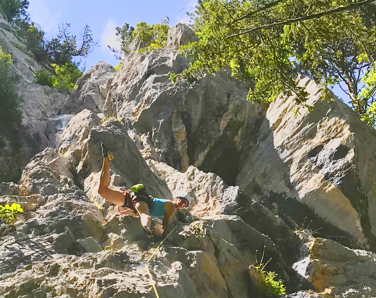 Le lendemain, nous partons à la découverte d’une première falaise, la Parete dell’Aquile (ou la falaise des aigles). Autant dire que je n’ai jamais compris pourquoi elle avait été nommée ainsi. Pas d’aigle à l’horizon. Tant pis. Il nous a fallu plus d’une heure pour arriver au pied de la falaise au lieu des 30 minutes indiquées dans le topo, tellement les indications sont précises. La falaise était top par contre, même si la petite 6b+ que nous avons tentée avec Loic était loin d’être facile. Une belle voie multi-style comprenant un départ en surplomb, une traversée en dalle et des pas verticaux pour finir en 5a avec des beaux bacs sur un mètre cinquante.