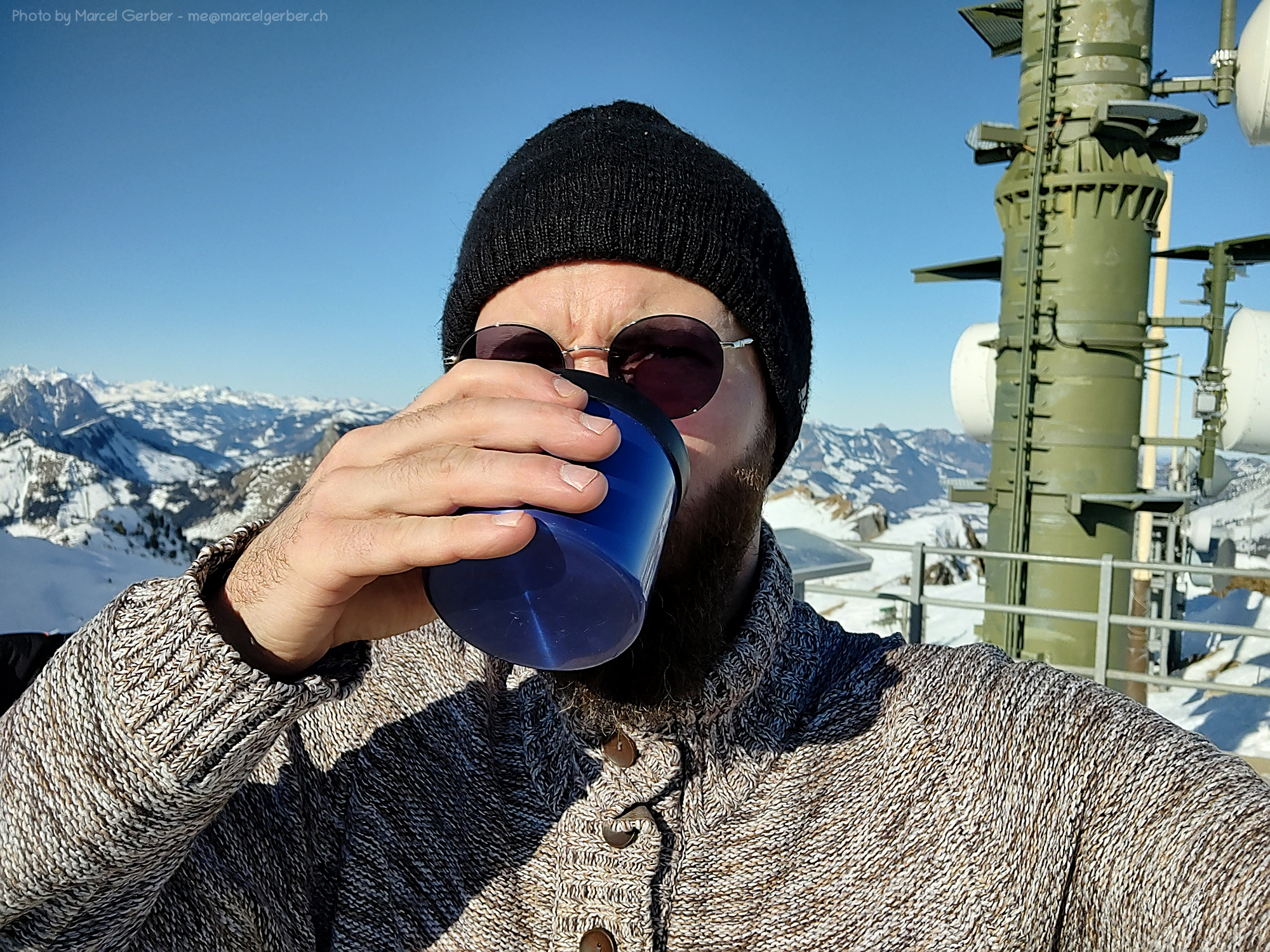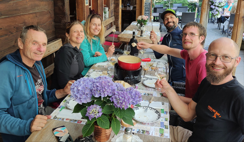 Le soleil couchant nous a montré les montagnes rosées et la température du fond de l’air s’est fait ressentir et nous avons migré vers la table réservée sous l’auvent. Nous avions du coup commandé cinq fondues, car Anja voulait partir.