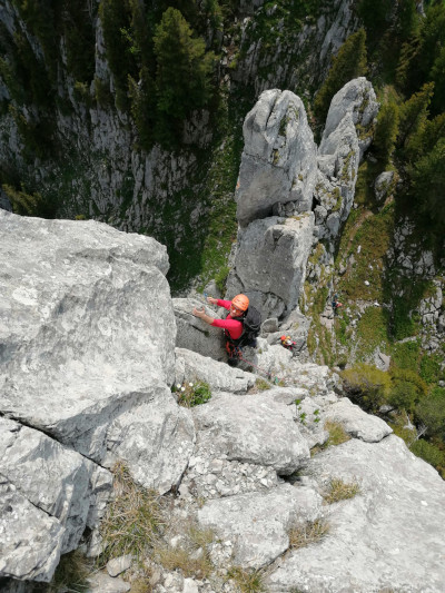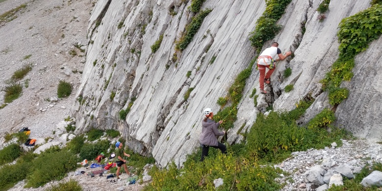Autant dire, que le réveil tôt que nous avions prévu pour la dernière journée, nous l’avons tous raté. Avec Martina, nous pensons partir vers les 14 heures au plus tard, en espérant arriver entre 20 et 22 heures à la maison. Pari réussi, malgré quelques allers-retours pour trouver la bonne petite route de montagne. Virginie a décidé de faire une petite longue voie avec Loic et Xavier afin de réapprendre les manips. La falaise de Tre Porcellini nous a accueillie avec quelques italiens et allemands qui nous ont proposé une première 5c très sympa. Ensuite nous avons fait une 5c/6a de deux longueurs avec une corde.