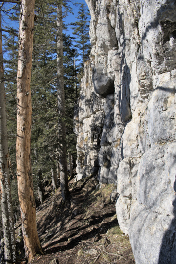 L'on arrive au Grand Mur, qui est le secteur des "spidermans", car il n'y a rien en-dessous de 6b. Pour des voies accessibles, il faut continuer le chemin en longeant le mur par la droite (main gauche au mur). Par contre, le pied des voies est plat sur ce secteur.