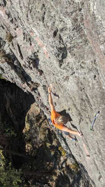 Par la suite, nous avons gravi la fissure sur sa première longueur. Celle-ci aussi est super chouette et offre des jolies prises, des très bons pieds et des bonnes mains. Tout en vertical, ce mur est très bien pour entraîner la poussée sur les pieds en gardant l'équilibre. Ce mur se prête aussi très bien pour essayer la trad, technique utilisant des coinceurs en tous genres. Ce que j'ai fait pour la deuxième ascension, tout en équipant un spit entre deux, pour m'assurer en cas de mauvais coinçage.
