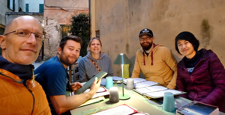 Le soir, rebelotte, petit apéro et restaurant. Oui petit l’apéro, on ne peut pas toujours manger autant. Le restaurant choisi par Martina et Virginie est l’Osteria Grotesque, un chouette petit bistrot encastré dans une de ses maisons un peu étroites. Des serveurs supers sympas, un menu à faire saliver, une ambiance chaleureuse et amicale et des plats délicieux nous ont confirmés que le choix avait été bien fait. La soirée est déjà bien lancée, quand un groupe de jeunes allemands passe dans la ruelle. L’un des mecs à les cheveux blonds, des vêtements bleu et un bonnet rouge. Tous, nous nous mettons à rigoleren pointant le Grand Schtroumpf du doigt. Là, Schtroumpfette vient vers moi, me regarde avec des yeux furax et me demande ce qu’il y a. Alors je lui montre le Grand Schtroumpf, et lui dis «Gross Schlumpf» ne sachant plus comment ça se dit en allemand. Et là elle merépond «Ah, Papa Schlumpf», se marre bien et retourne raconter la blague à ses potes.