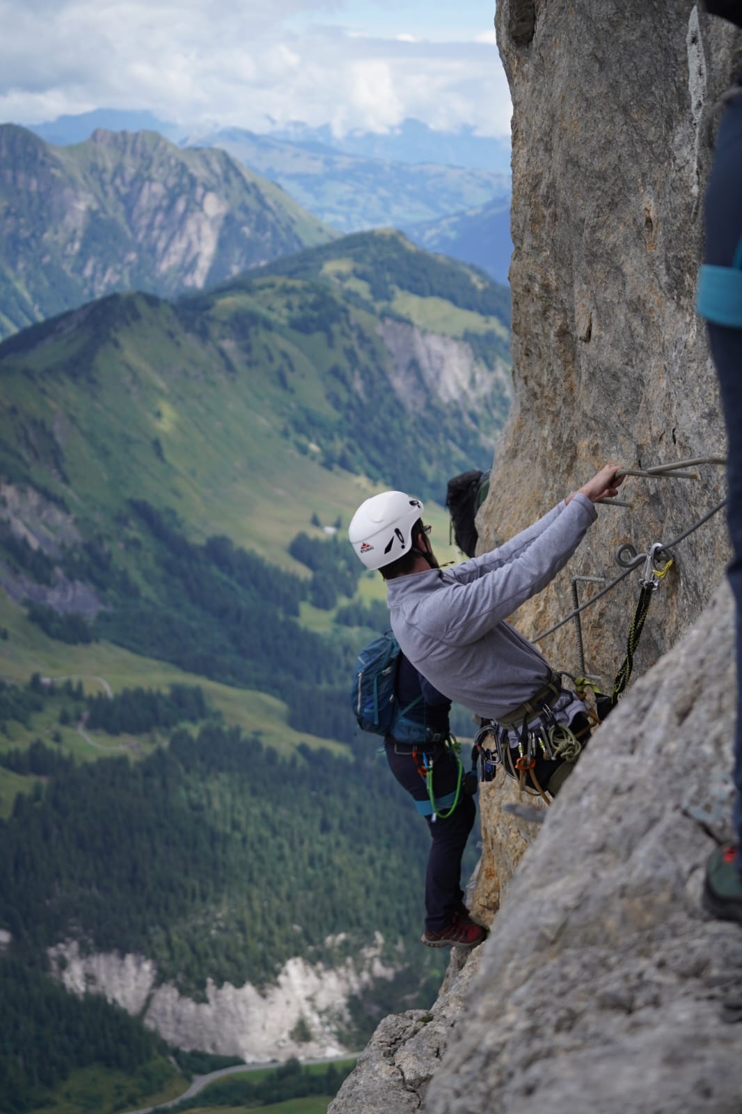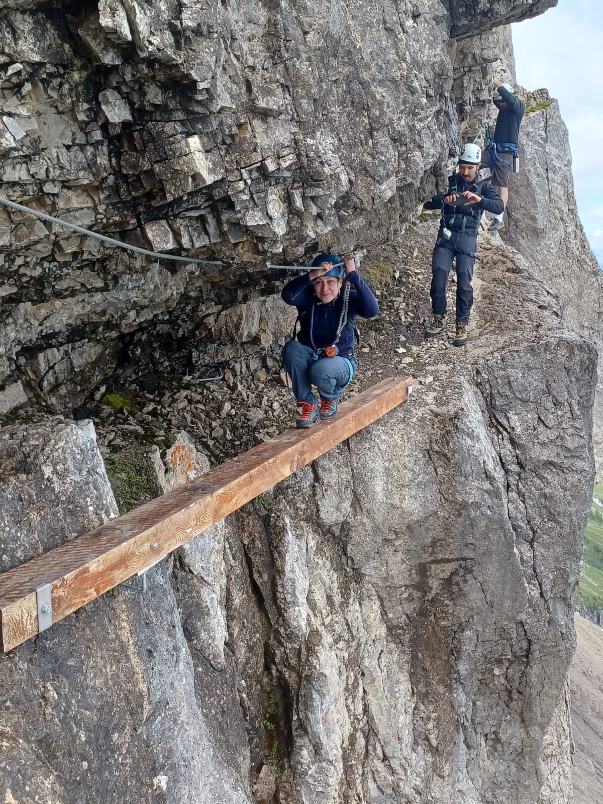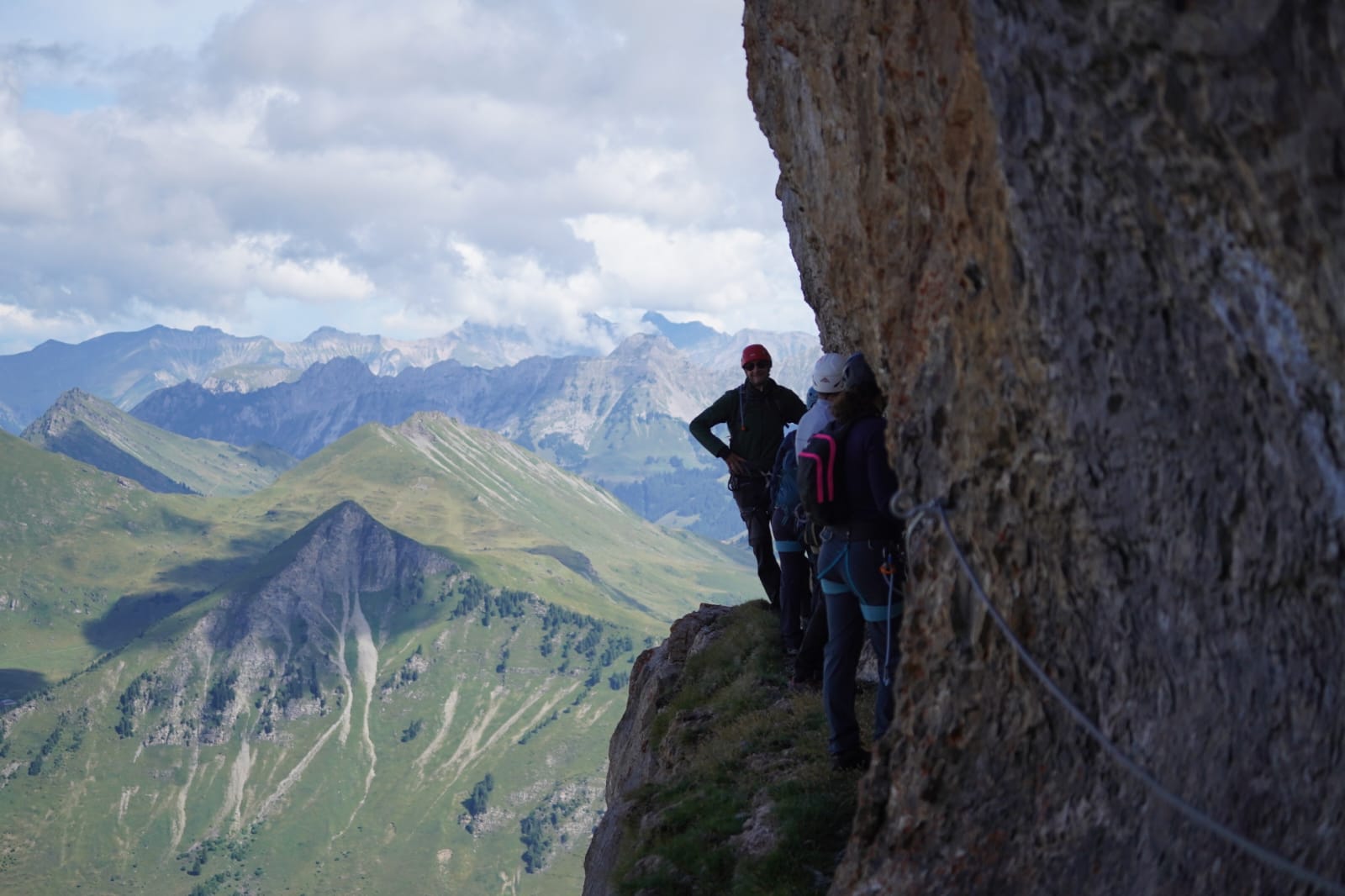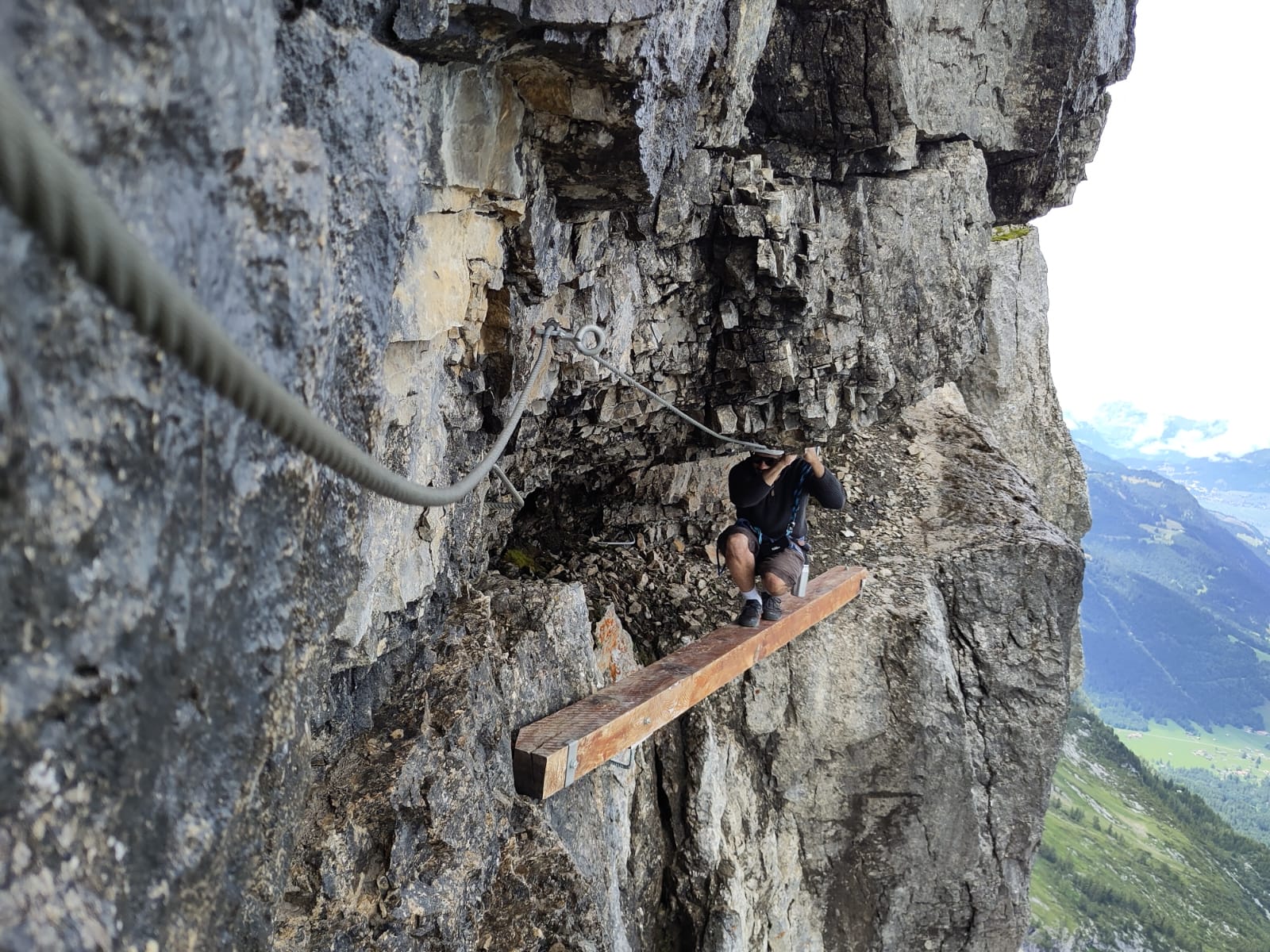 Le dimanche matin, la météo était plus clémente. Pas de grimpe cette fois encore, mais une activité toute aussi verticale : la via ferrata de la Tête aux Chamois (Rocher Jaune), accessible depuis le premier arrêt de la télécabine. Ouverte spécialement lors du FIFAD 1999, elle offre un parcours sportif, avec du gaz et quelques passages impressionnants, dont la fameuse poutre à franchir accroupi.