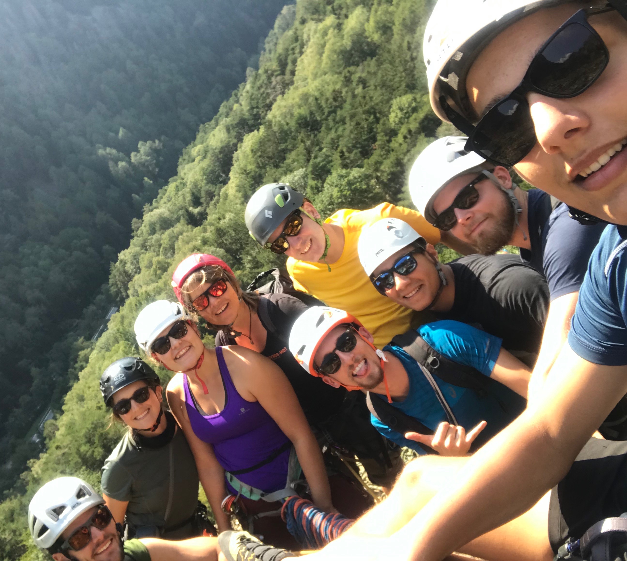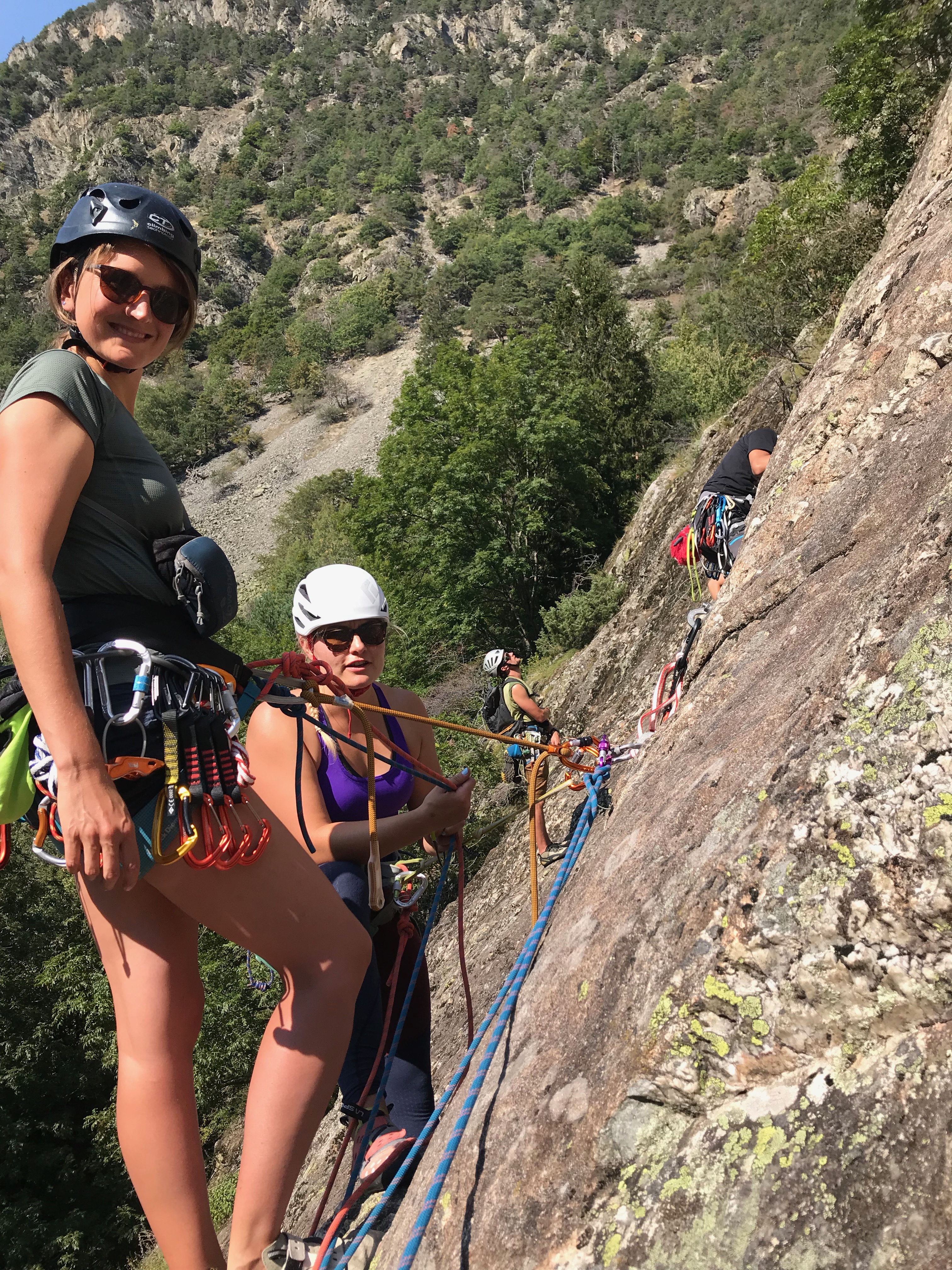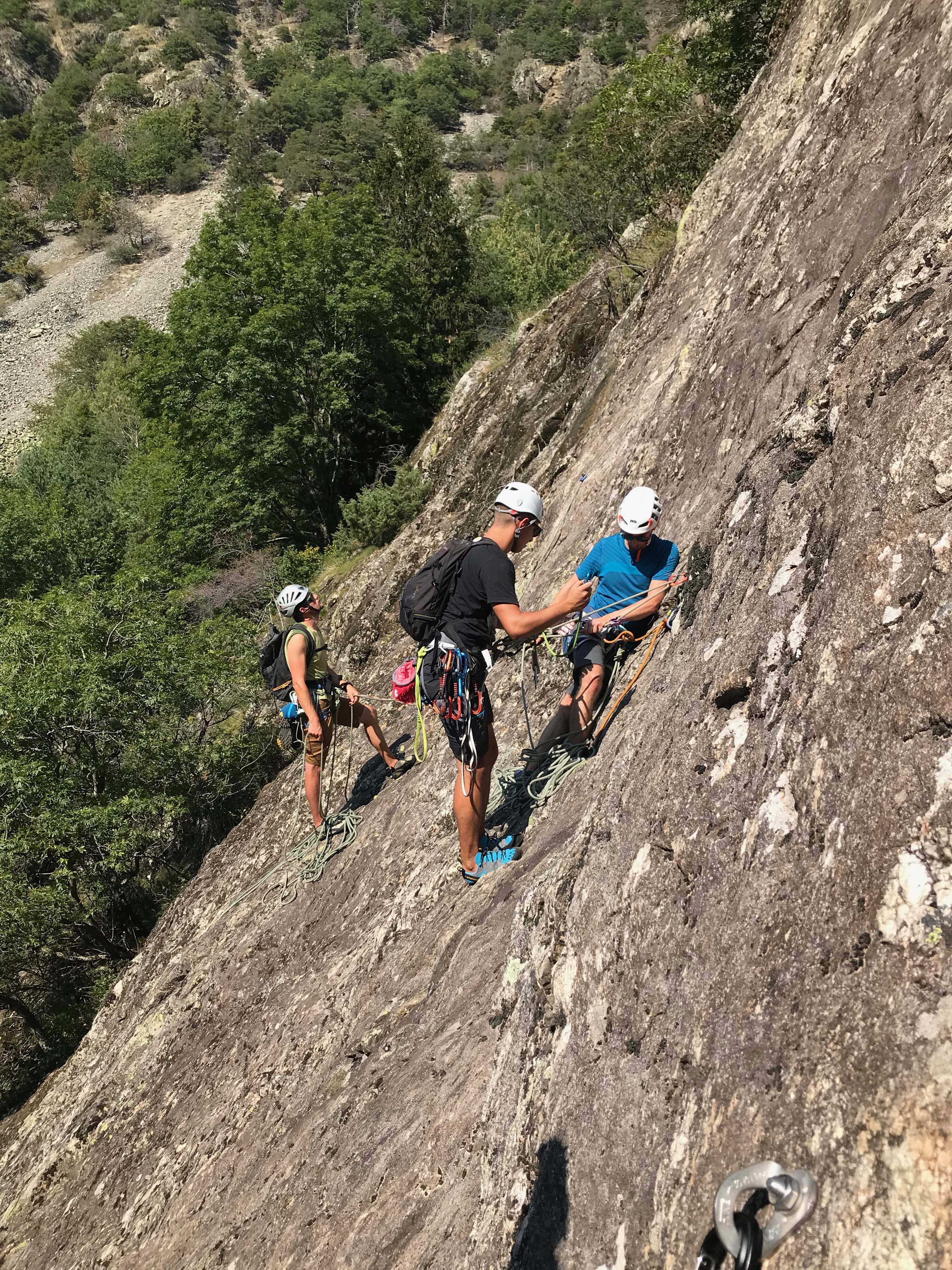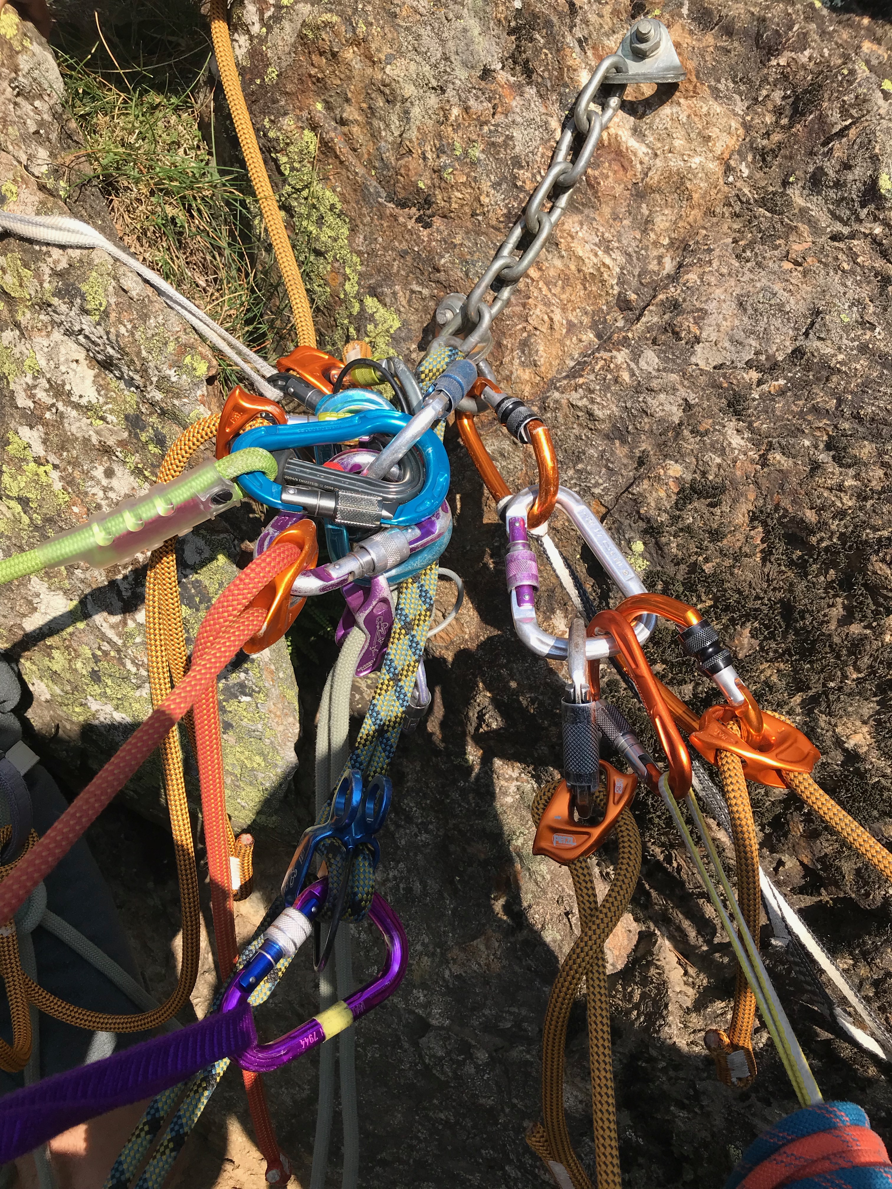 « Devinette: combien de grimpeurs se sont-ils attachés sur ce relais. (Mais VOUI, c’est conforme aux recommandations PETZL.) »
